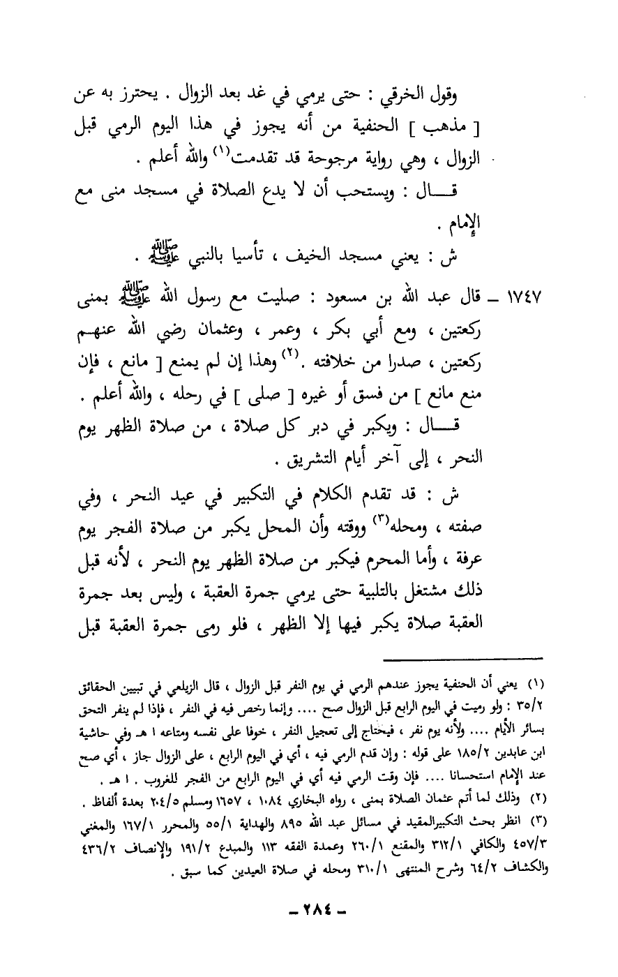 1747 - «قال عبد الله بن مسعود: صليت مع رسول الله - صَلَّى اللَّهُ عَلَيْهِ وَسَلَّمَ - بمنى ركعتين، ومع أبي بكر، وعمر، وعثمان، - رَضِيَ اللَّهُ عَنْهُمْ -، ركعتين، صدرا من خلافته» . وهذا إن لم يمنع [مانع، فإن منع مانع] من فسق أو غيره [صلى] في رحله، والله أعلم.
