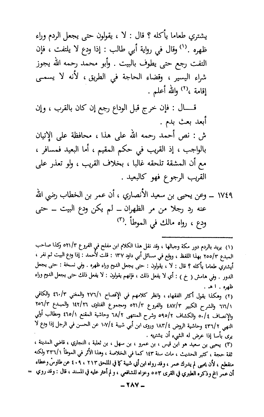 يشتري طعاما يأكله؟ قال: لا، يقولون حتى يجعل الردم وراء ظهره. وقال في رواية أبي طالب: إذا ودع لا يلتفت، فإن التفت رجع حتى يطوف بالبيت، وأبو محمد، - رَحِمَهُ اللَّهُ -، يجوز شراء اليسير، وقضاء الحاجة في الطريق، لأنه لا يسمى إقامة، والله أعلم.