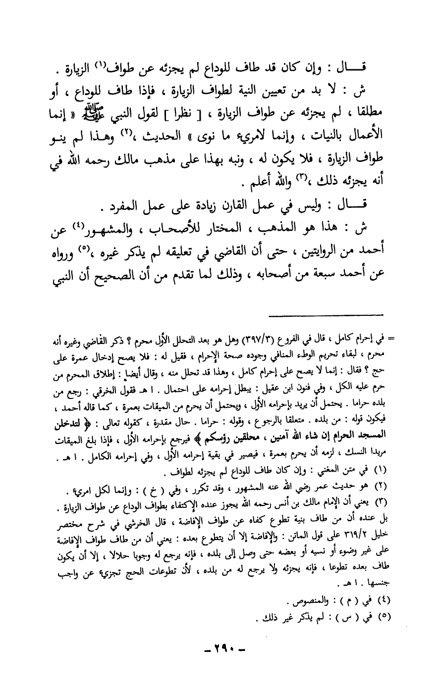 ش: لا بد من تعيين النية لطواف الزيارة، فإذا طاف للوداع، أو مطلقا، لم يجزئه عن طواف الزيارة، [نظرا] لقول النبي - صَلَّى اللَّهُ عَلَيْهِ وَسَلَّمَ - «إنما الأعمال بالنيات، وإنما لامرئ ما نوى» . الحديث، وهذا لم ينو طواف الزيارة، فلا يكون له، ونبه بهذا على مذهب مالك، - رَحِمَهُ اللَّهُ -، في أنه يجزئه ذلك، والله أعلم.