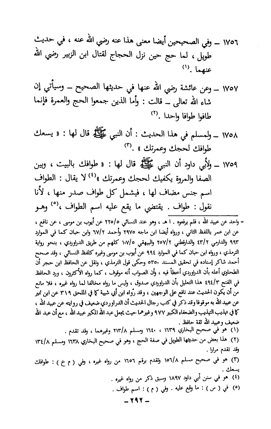 1759 - ولأبي داود أن النبي - صَلَّى اللَّهُ عَلَيْهِ وَسَلَّمَ - قال لها: «طوافك بالبيت وبين الصفا والمروة، يكفيك لحجك وعمرتك» . لا يقال: الطواف اسم جنس مضاف لها، فيشمل كل طواف صدر منها، لأنا نقول: طواف. يقتضي ما يقع عليه اسم الطواف، وهو