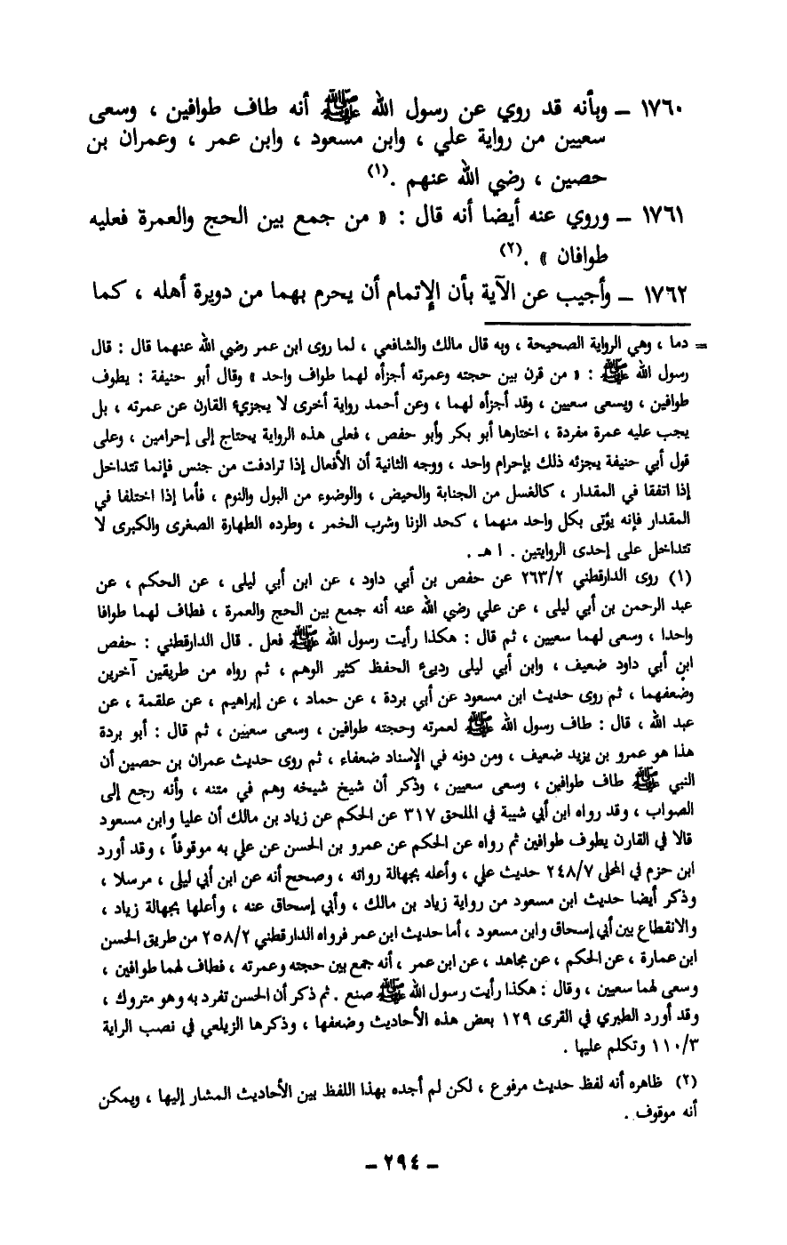 1760 - وبأنه قد روي «عن رسول الله - صَلَّى اللَّهُ عَلَيْهِ وَسَلَّمَ - أنه طاف طوافين، وسعى سعيين» من رواية علي، وابن مسعود، وابن عمر، وعمران بن حصين، - رَضِيَ اللَّهُ عَنْهُمْ -.