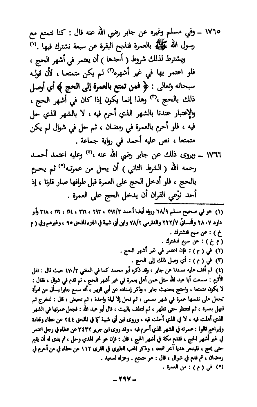 1765 - وفي مسلم وغيره عن جابر - رَضِيَ اللَّهُ عَنْهُ - قال: «كنا نتمتع مع رسول الله - صَلَّى اللَّهُ عَلَيْهِ وَسَلَّمَ - بالعمرة فنذبح البقرة عن سبعة نشترك فيها» .