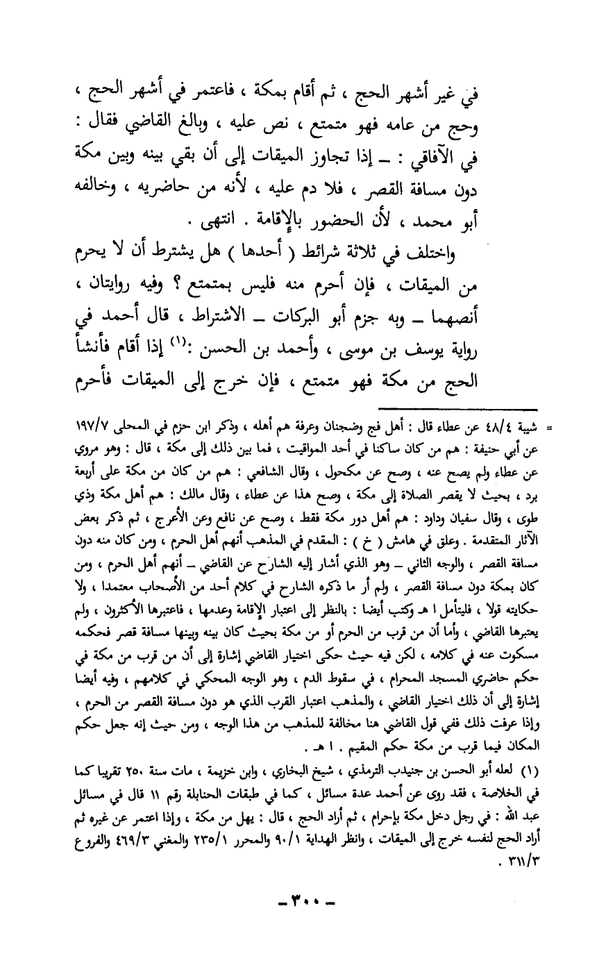 واختلف في ثلاثة شرائط، (أحدها) : هل يشترط أن لا يحرم من الميقات، فإن أحرم منه فليس بمتمتع؟ وفيه روايتان، أنصهما - وبه جزم أبو البركات - الاشتراط، قال أحمد في رواية يوسف بن موسى، وأحمد بن الحسن: إذا أقام فأنشأ الحج من مكة فهو متمتع، فإن خرج إلى الميقات فأحرم