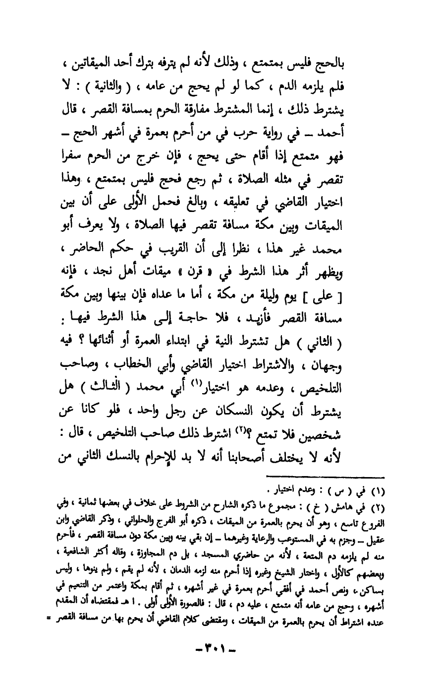 (والثانية) : لا يشترط ذلك، إنما المشترط مفارقة الحرم بمسافة القصر، قال أحمد - في رواية حرب في من أحرم بعمرة في أشهر الحج - فهو متمتع إذا أقام حتى يحج، فإن خرج من الحرم سفرا تقصر في مثله الصلاة، ثم رجع فحج فليس بمتمتع، وهذا اختيار القاضي في تعليقه، وبالغ فحمل الأولى على أن بين الميقات وبين مكة مسافة تقصر فيها الصلاة، ولا يعرف أبو محمد غير هذا، نظرا إلى أن القريب في حكم الحاضر، ويظهر أثر هذا الشرط في «قرن» ميقات أهل نجد، فإنه [على] يوم وليلة من مكة، أما ما عداه فإن بينها وبين مكة مسافة القصر فأزيد، فلا حاجة إلى هذا الشرط فيها.: