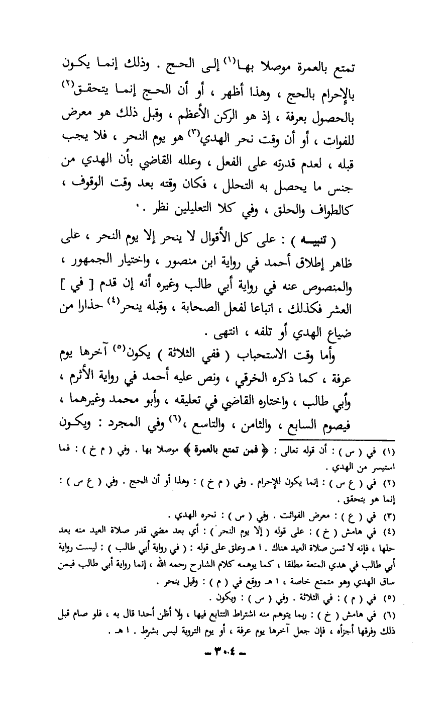 (تنبيه) : على كل الأقوال لا ينحر إلا يوم النحر، على ظاهر إطلاق أحمد في رواية ابن منصور، واختيار الجمهور، والمنصوص عنه في رواية أبي طالب وغيره أنه إن قدم [في] العشر فكذلك، اتباعا لفعل الصحابة، وقبله ينحر حذارا من ضياع الهدي أو تلفه، انتهى.