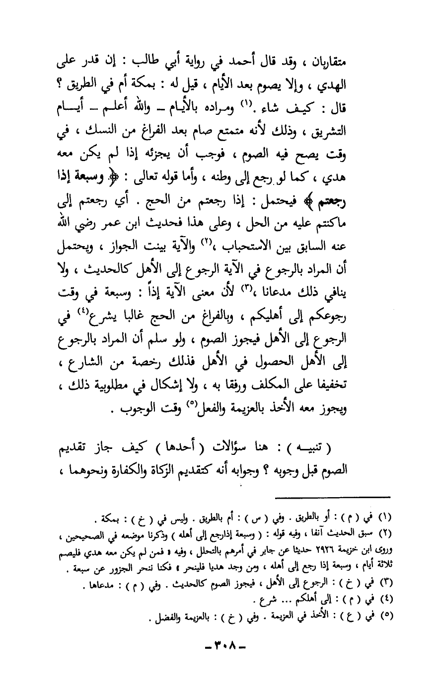 متقاربان، وقد قال أحمد في رواية أبي طالب: إن قدر على الهدي، وإلا يصوم بعد الأيام، قيل له: بمكة أم في الطريق؟ قال: كيف شاء. ومراده بالأيام - والله أعلم: أيام التشريق، وذلك لأنه متمتع صام بعد الفراغ من النسك، في وقت يصح فيه الصوم، فوجب أن يجزئه إذا لم يكن معه هدي، كما لو رجع إلى وطنه. وأما قَوْله تَعَالَى: {وَسَبْعَةٍ إِذَا رَجَعْتُمْ} [البقرة: 196] ، فيحتمل: إذا رجعتم من الحج. أي: رجعتم إلى ما كنتم عليه من الحل، وعلى هذا فحديث ابن عمر - رَضِيَ اللَّهُ عَنْهُ - السابق بين الاستحباب، والآية بينت الجواز، ويحتمل أن المراد بالرجوع في الآية الرجوع إلى الأهل كالحديث، ولا ينافي ذلك مدعانا، لأن معنى الآية إذا: وسبعة في وقت رجوعكم إلى أهليكم، وبالفراغ من الحج غالبا يشرع في الرجوع إلى الأهل فيجوز الصوم، ولو سلم أن المراد بالرجوع إلى الأهل الحصول في الأهل فذلك رخصة من الشارع، تخفيفا على المكلف ورفقا به، ولا إشكال في مطلوبية ذلك، ويجوز معه الأخذ بالعزيمة والفعل وقت الوجوب.