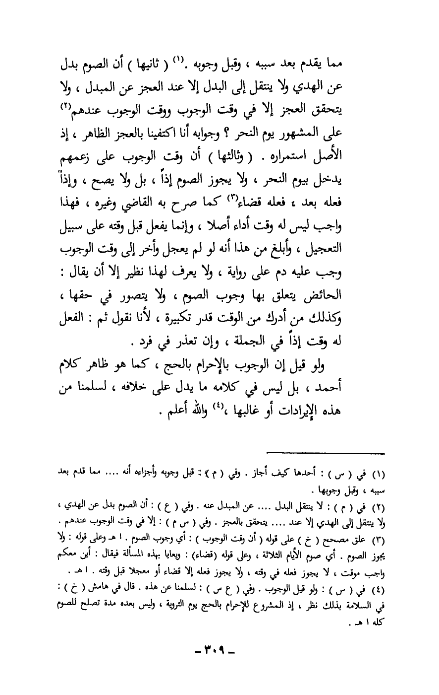 (وثالثها) أن وقت الوجوب على زعمهم يدخل بيوم النحر، ولا يجوز الصوم إذا، بل ولا يصح، وإذا فعله بعد، فعله قضاء كما صرح به القاضي وغيره، فهذا واجب ليس له وقت أداء أصلا، وإنما يفعل قبل وقته على سبيل التعجيل، وأبلغ من هذا أنه لو لم يعجل وأخر إلى وقت الوجوب وجب عليه دم على رواية، ولا يعرف لهذا نظير إلا أن يقال: الحائض يتعلق بها وجوب الصوم، ولا يتصور في حقها، وكذلك من أدرك من الوقت قدر تكبيرة، لأنا نقول ثم: الفعل له وقت إذا في الجملة، وإن تعذر في فرد. ولو قيل: إن الوجوب بالإحرام بالحج، كما هو ظاهر كلام أحمد، بل ليس في كلامه ما يدل على خلافه، لسلمنا من هذه الإيرادات أو غالبها، والله أعلم.