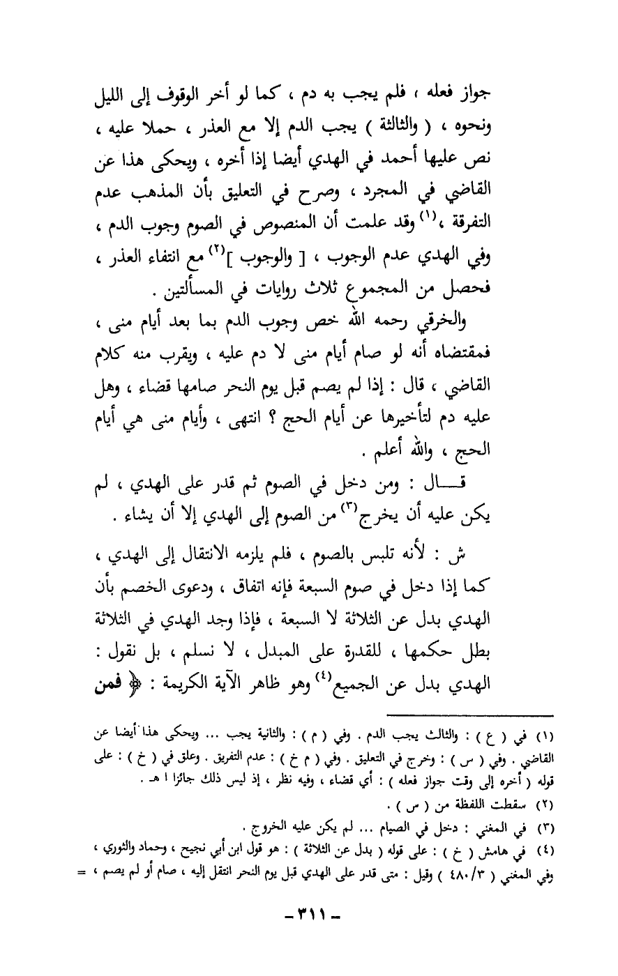 جواز فعله، فلم يجب به دم، كما لو أخر الوقوف إلى الليل ونحوه، (والثالثة) يجب الدم إلا مع العذر، حملا عليه، نص عليها أحمد في الهدي أيضا إذا أخره، ويحكى هذا عن القاضي في المجرد، وصرح في التعليق بأن المذهب عدم التفرقة، وقد علمت أن المنصوص في الصوم وجوب الدم، وفي الهدي عدم الوجوب، والوجوب مع انتفاء العذر، فحصل من المجموع ثلاث روايات في المسألتين.