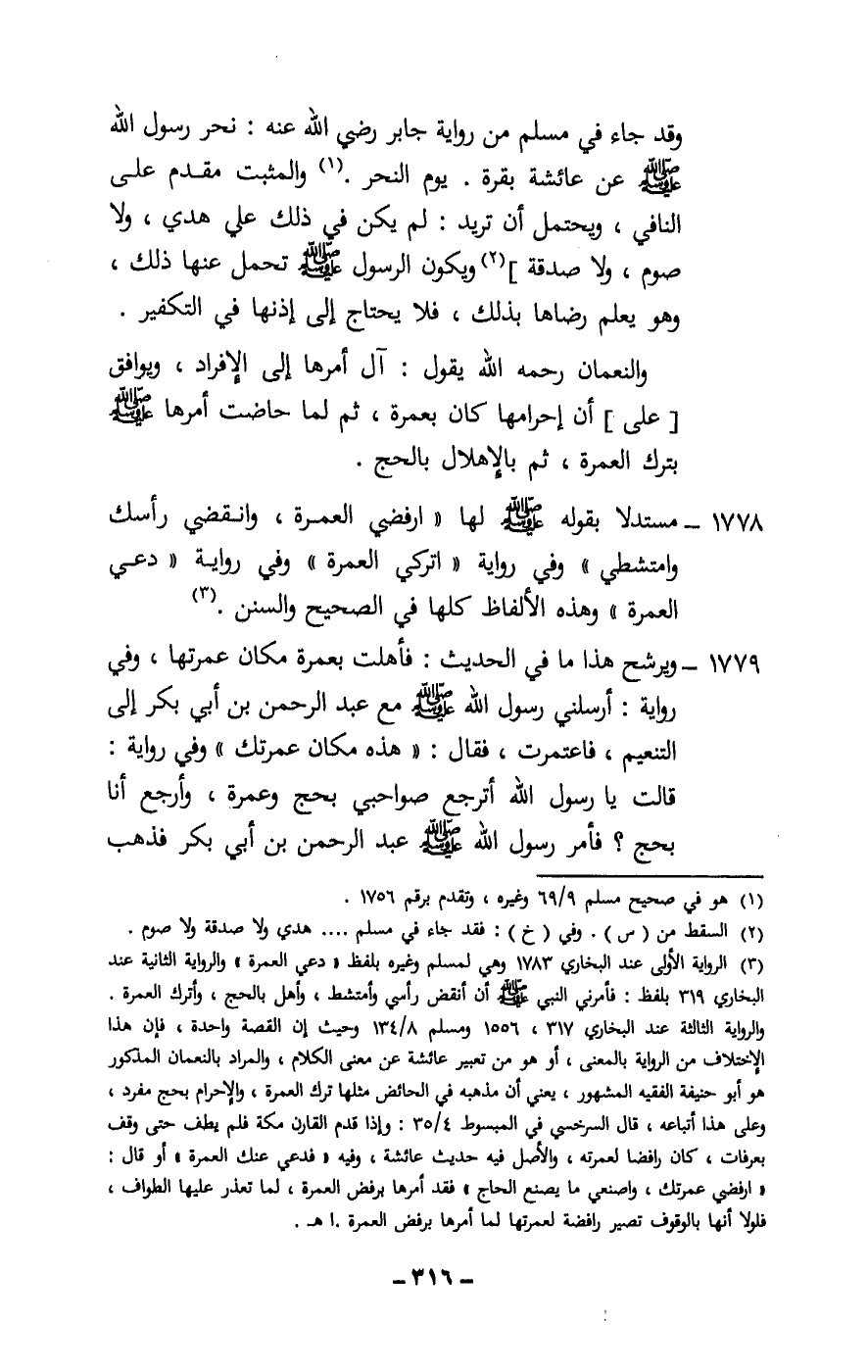 1779 - ويرشح هذا ما في الحديث: فأهلت بعمرة مكان عمرتها، وفي رواية: «أرسلني رسول الله - صَلَّى اللَّهُ عَلَيْهِ وَسَلَّمَ - مع عبد الرحمن بن أبي بكر إلى التنعيم، فاعتمرت، فقال: «هذه مكان عمرتك» . وفي رواية: «قالت يا رسول الله أترجع صواحبي بحج وعمرة، وأرجع أنا بحج؟ فأمر رسول الله - صَلَّى اللَّهُ عَلَيْهِ وَسَلَّمَ - عبد الرحمن بن أبي بكر فذهب