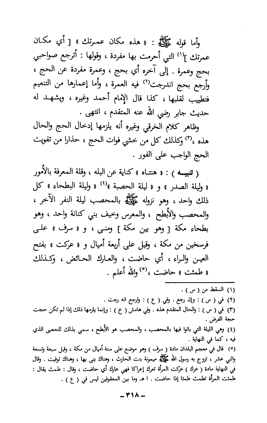(تنبيه) : «هنتاه» ، كناية عن البله، وقلة المعرفة بالأمور. «وليلة الصدر» ، و «ليلة الحصبة» ، «وليلة البطحاء» ، كل ذلك واحد، وهو نزوله - صَلَّى اللَّهُ عَلَيْهِ وَسَلَّمَ - بالمحصب ليلة النفر الآخر، والمحصب والأبطح، والمعرس وخيف بني كنانة واحد، وهو بطحاء مكة [وهو بين مكة] ومنى. و «سرف» ، على فرسخين من مكة، وقيل: على أربعة أميال. و «عركت» ، بفتح العين والراء، أي: حاضت، والعارك: الحائض، وكذلك «طمثت» ، حاضت، والله أعلم.