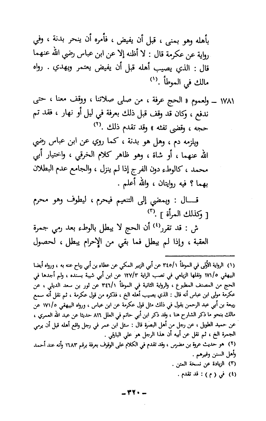 1781 - ولعموم: «الحج عرفة، من صلى صلاتنا، ووقف معنا، حتى ندفع، وكان قد وقف قبل ذلك بعرفة في ليل أو نهار، فقد تم حجه، وقضى تفثه» . وقد تقدم ذلك.