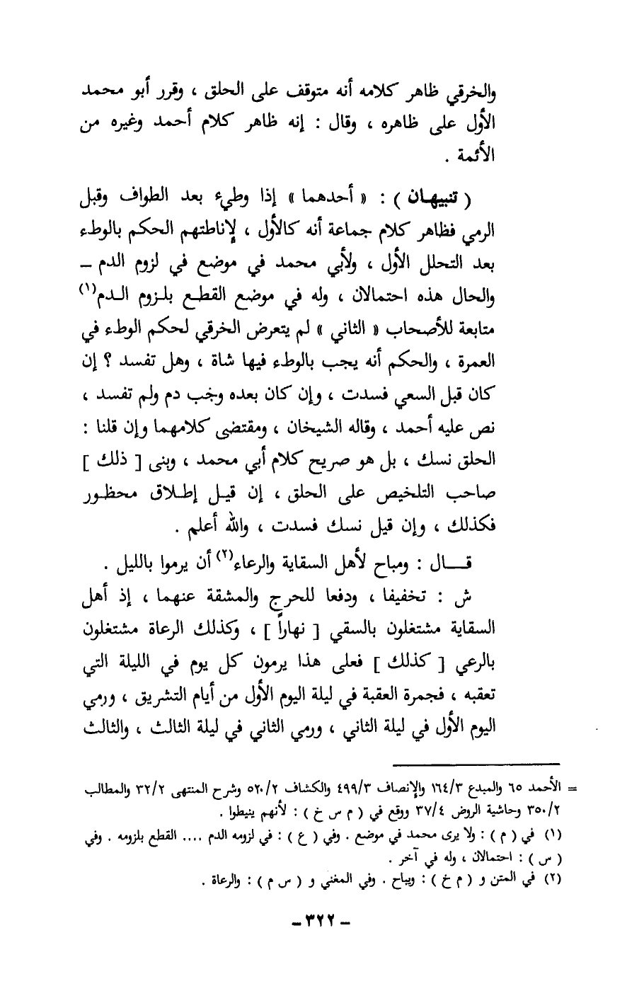 والخرقي ظاهر كلامه أنه متوقف على الحلق، وقرر أبو محمد الأول على ظاهره، وقال: إنه ظاهر كلام أحمد وغيره من الأئمة.