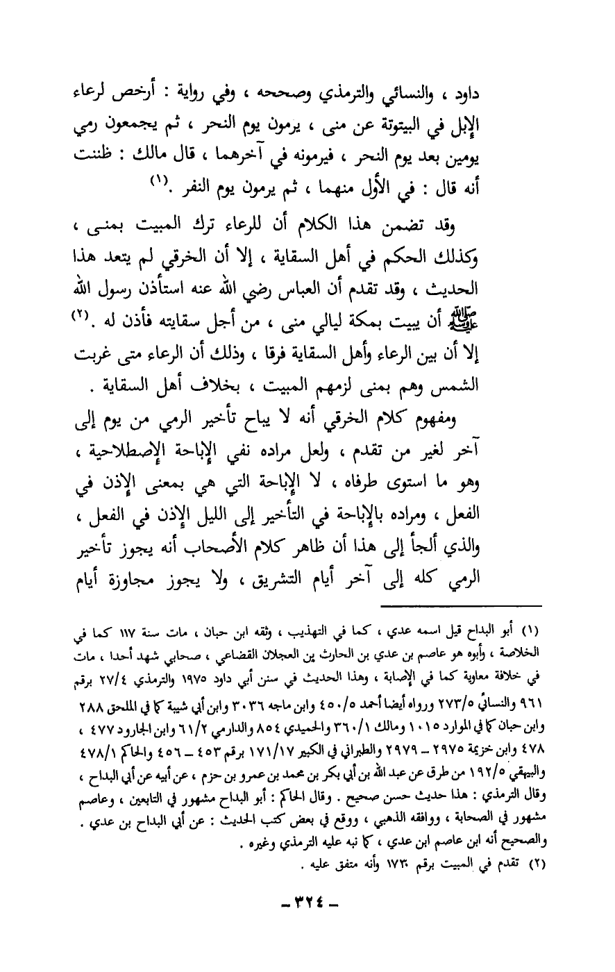 وقد تضمن هذا الكلام أن للرعاء ترك المبيت بمنى، وكذلك الحكم في أهل السقاية، إلا أن الخرقي لم يتعد هذا الحديث، وقد تقدم أن العباس - رَضِيَ اللَّهُ عَنْهُ - استأذن رسول الله - صَلَّى اللَّهُ عَلَيْهِ وَسَلَّمَ - أن يبيت بمكة ليالي منى، من أجل سقايته فأذن له. إلا أن بين الرعاء وأهل السقاية فرقا، وذلك أن الرعاء متى غربت الشمس وهم بمنى لزمهم المبيت، بخلاف أهل السقاية. ومفهوم كلام الخرقي أنه لا يباح تأخير الرمي من يوم إلى آخر لغير من تقدم، ولعل مراده نفي الإباحة الاصطلاحية، وهو ما استوى طرفاه، لا الإباحة التي هي بمعنى الإذن في الفعل، ومراده بالإباحة في التأخير إلى الليل الإذن في الفعل، والذي ألجأ إلى هذا أن ظاهر كلام الأصحاب أنه يجوز تأخير الرمي كله إلى آخر أيام التشريق، ولا يجوز مجاوزة أيام