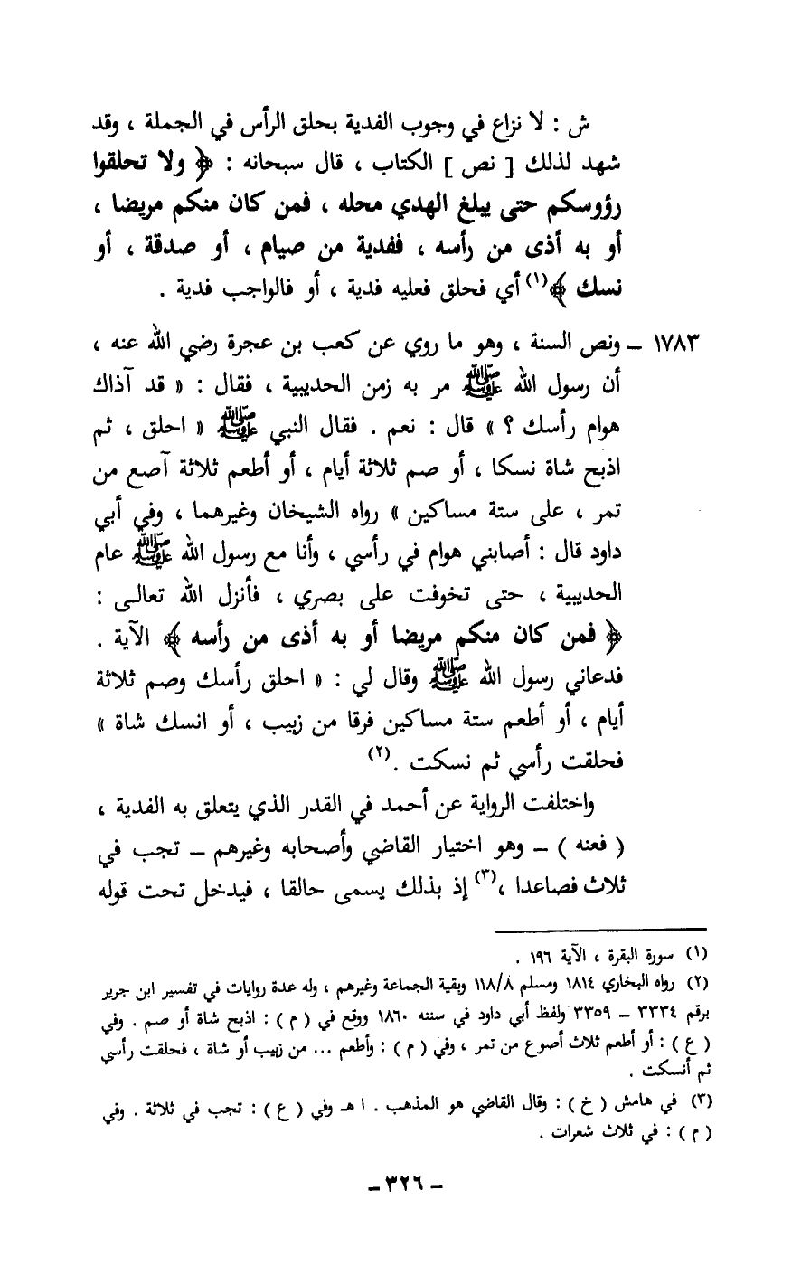 1783 - ونص السنة، وهو ما روي عن كعب بن عجرة - رَضِيَ اللَّهُ عَنْهُ -، «أن رسول الله - صَلَّى اللَّهُ عَلَيْهِ وَسَلَّمَ - مر به زمن الحديبية، فقال: «قد آذاك هوام رأسك؟» . قال: نعم. فقال النبي - صَلَّى اللَّهُ عَلَيْهِ وَسَلَّمَ - «احلق، ثم اذبح شاة نسكا، أو صم ثلاثة أيام، أو أطعم ثلاثة آصع من تمر، على ستة مساكين» . رواه الشيخان وغيرهما، وفي أبي داود قال: «أصابني هوام في رأسي، وأنا مع رسول الله - صَلَّى اللَّهُ عَلَيْهِ وَسَلَّمَ - عام الحديبية، حتى تخوفت على بصري، فأنزل الله تعالى: {فَمَنْ كَانَ مِنْكُمْ مَرِيضًا أَوْ بِهِ أَذًى مِنْ رَأْسِهِ} [البقرة: 196] الآية. فدعاني رسول الله - صَلَّى اللَّهُ عَلَيْهِ وَسَلَّمَ - وقال لي: «احلق رأسك وصم ثلاثة أيام، أو أطعم ستة مساكين فرقا من زبيب، أو انسك شاة» . فحلقت رأسي ثم نسكت» .