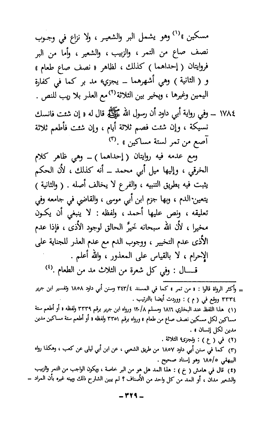 مسكين» . وهو يشمل البر والشعير، ولا نزاع في وجوب نصف صاع من التمر، والزبيب، والشعير، وأما من البر فروايتان (إحداهما) كذلك، لظاهر: «نصف صاع طعام» . و (الثانية) وهي أشهرهما - يجزئ مد بر كما في كفارة اليمين وغيرها، ويخير بين الثلاثة مع العذر بلا ريب للنص.