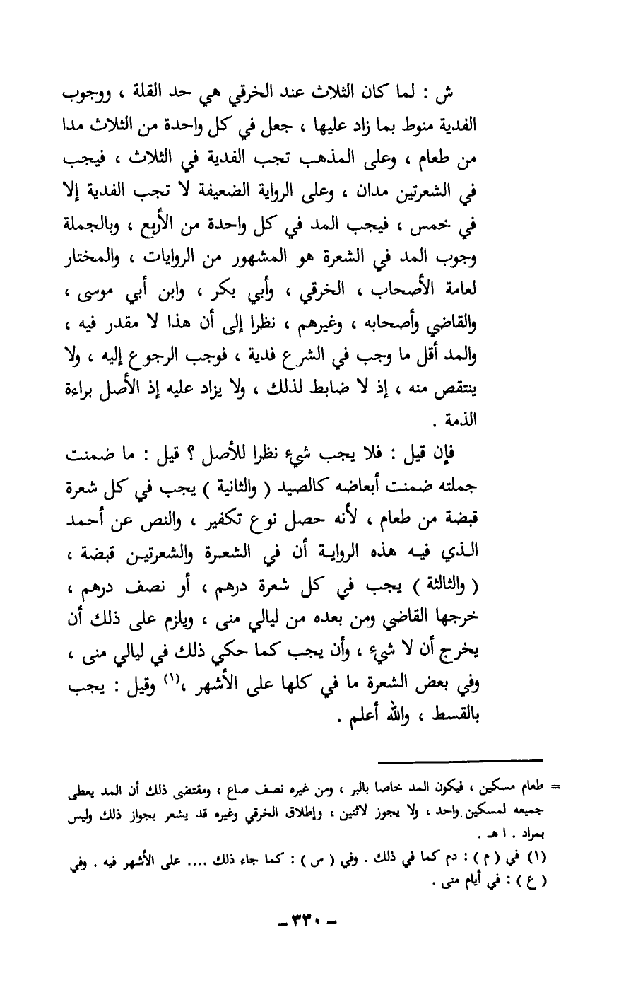 وبالجملة وجوب المد في الشعرة هو المشهور من الروايات، والمختار لعامة الأصحاب؛ الخرقي، وأبي بكر، وابن أبي موسى، والقاضي وأصحابه، غيرهم، نظرا إلى أن هذا لا مقدر فيه، والمد أقل ما وجب في الشرع فدية، فوجب الرجوع إليه، ولا ينتقص منه، إذ لا ضابط لذلك، ولا يزاد عليه إذ الأصل براءة الذمة.