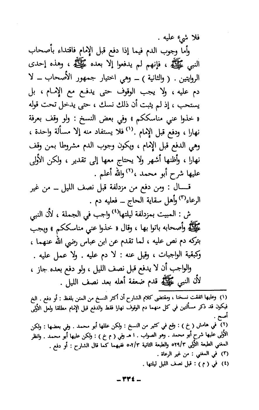 (والثانية) - وهي اختيار جمهور الأصحاب - لا دم عليه، ولا يجب الوقوف حتى يدفع مع الإمام، بل يستحب، إذ لم يثبت أن ذلك نسك، حتى يدخل تحت قوله: «خذوا عني مناسككم» .