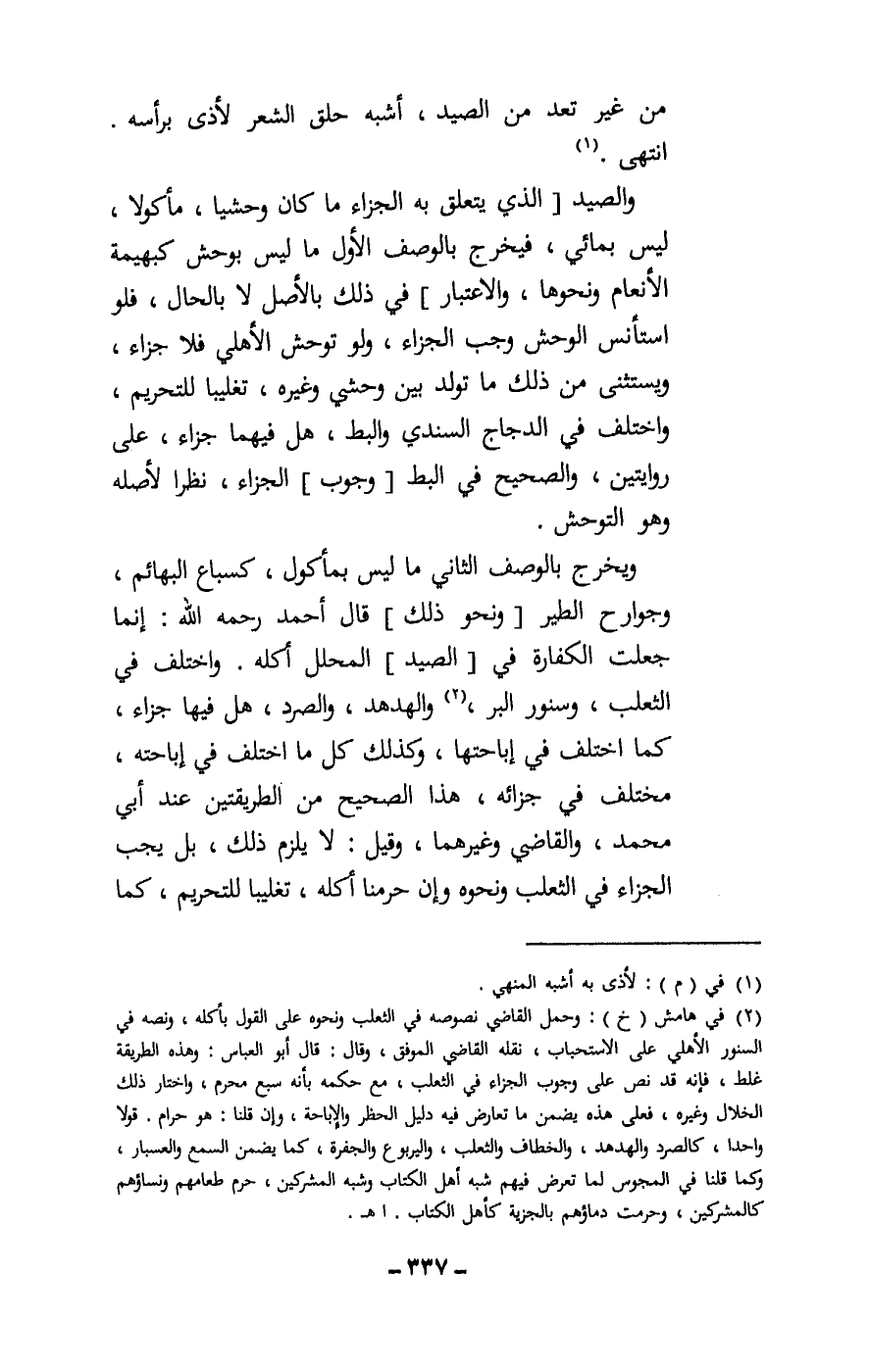 ويخرج بالوصف الثاني ما ليس بمأكول، كسباع البهائم، وجوارح الطير [ونحو ذلك] ، قال أحمد - رَحِمَهُ اللَّهُ -: إنما جعلت الكفارة في [الصيد] المحلل أكله. واختلف في الثعلب، وسنور البر، والهدهد، والصرد، هل فيها جزاء؟ كما اختلف في إباحتها، وكذلك كل ما اختلف في إباحته، مختلف في جزائه، هذا الصحيح من الطريقتين عند أبي محمد، والقاضي وغيرهما، وقيل: لا يلزم ذلك، بل يجب الجزاء في الثعلب ونحوه وإن حرمنا أكله، تغليبا للتحريم، كما
