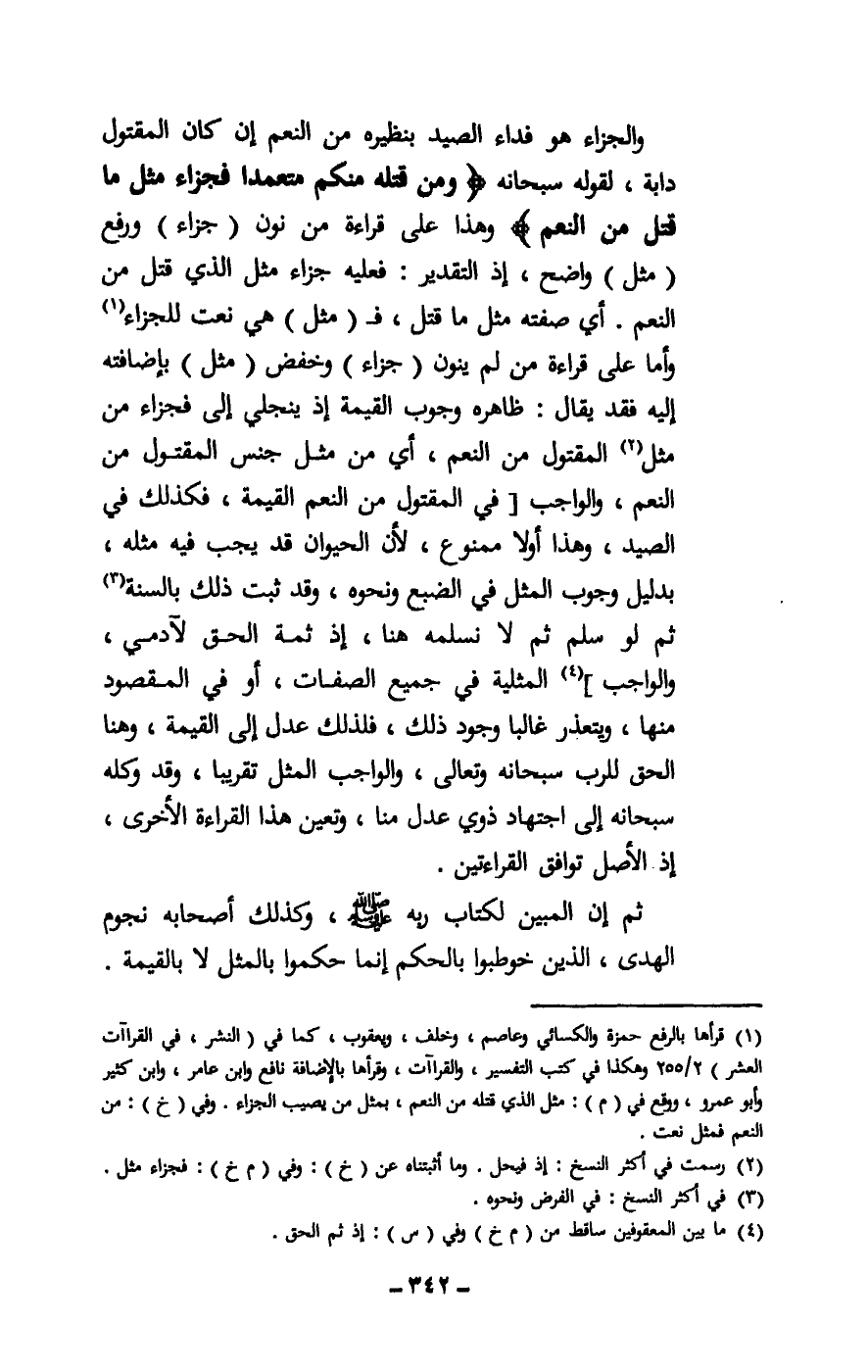 والجزاء هو فداء الصيد بنظيره من النعم إن كان المقتول دابة، لقوله سبحانه: {وَمَنْ قَتَلَهُ مِنْكُمْ مُتَعَمِّدًا فَجَزَاءٌ مِثْلُ مَا قَتَلَ مِنَ النَّعَمِ} [المائدة: 95] ، وهذا على قراءة من نون (جزاء) ورفع (مثل) واضح، إذ التقدير: فعليه جزاء مثل الذي قتل من النعم، أي: صفته مثل ما قتل، ف (مثل) هي نعت للجزاء. وأما على قراءة من لم ينون (جزاء) وخفض (مثل) بإضافته إليه، فقد يقال: ظاهره وجوب القيمة، إذ ينجلي إلى: فجزاء من مثل المقتول من النعم، أي: من مثل جنس المقتول من النعم، والواجب [في المقتول من النعم القيمة، فكذلك في الصيد. وهذا أولا ممنوع، لأن الحيوان قد يجب فيه مثله، بدليل وجوب المثل في الضبع ونحوه، وقد ثبت ذلك بالسنة، ثم لو سلم ثم لا نسلمه هنا، إذ ثمة الحق لآدمي، والواجب] المثلية في جميع الصفات، أو في المقصود منها، ويتعذر غالبا وجود ذلك، فلذلك عدل إلى القيمة، وهنا الحق للرب سبحانه وتعالى، والواجب المثل تقريبا، وقد وكله سبحانه إلى اجتهاد ذوي عدل منا، وتعين هذا القراءة الأخرى، إذ الأصل توافق القراءتين.