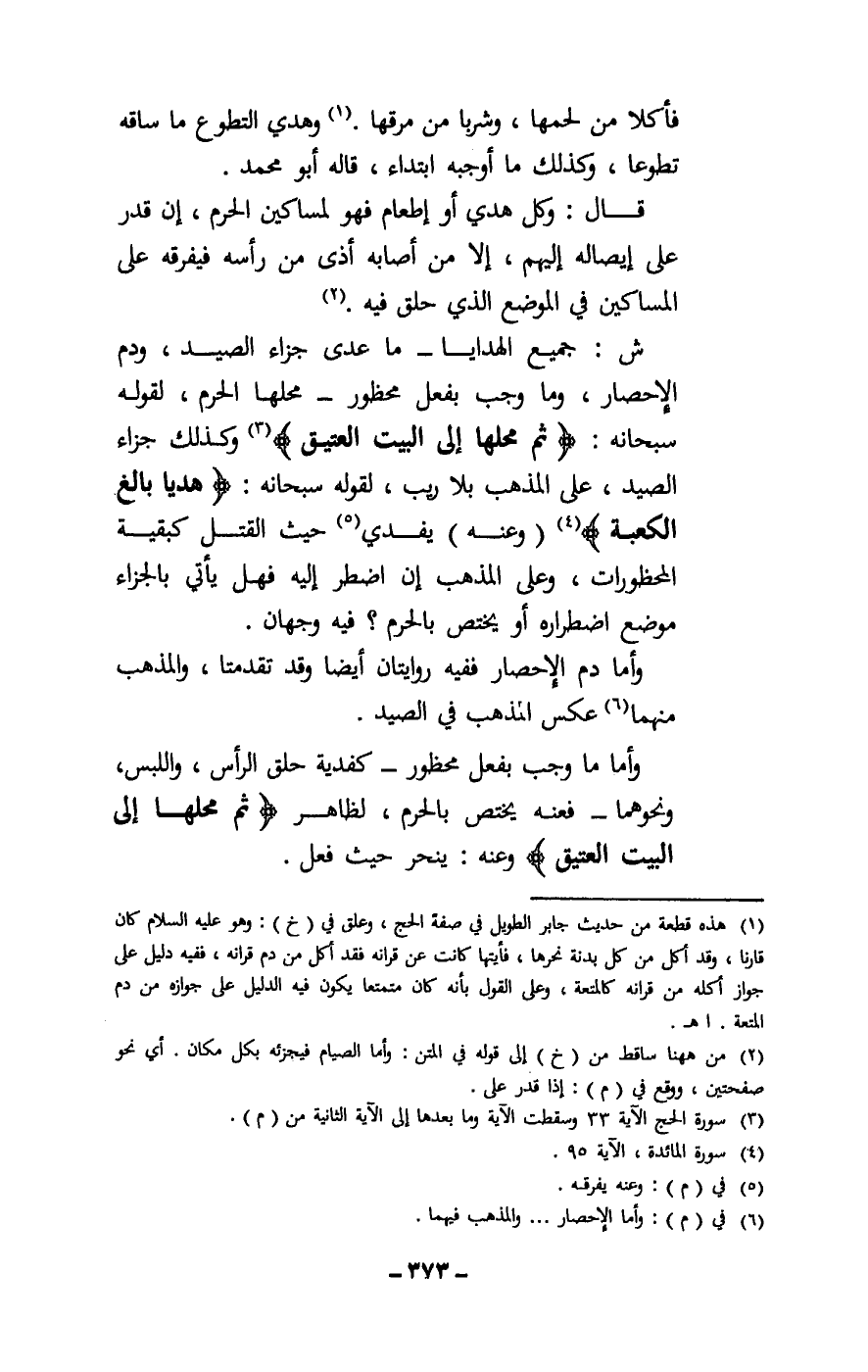 ش: جميع الهدايا - ما عدى جزاء الصيد، ودم الإحصار، وما وجب بفعل محظور - محلها الحرم، لقوله سبحانه: {ثُمَّ مَحِلُّهَا إِلَى الْبَيْتِ الْعَتِيقِ} [الحج: 33] ، وكذلك جزاء الصيد، على المذهب بلا ريب، لقوله سبحانه: {هَدْيًا بَالِغَ الْكَعْبَةِ} [المائدة: 95] .