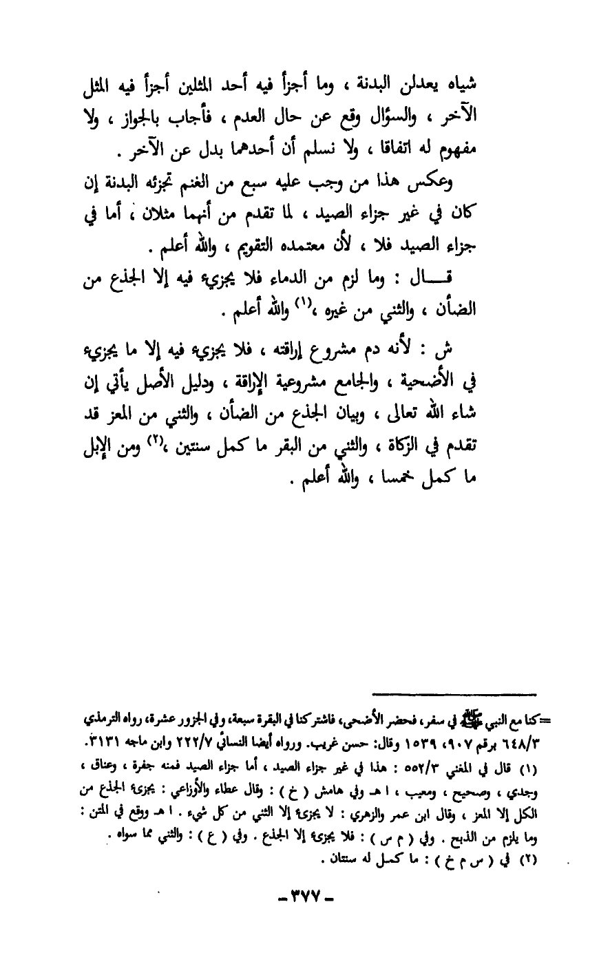 شياه يعدلن البدنة شياه يعدلن البدنة، وما أجزأ فيه أحد المثلين أجزأ فيه المثل الآخر، والسؤال وقع عن حال العدم، فأجاب بالجواز، ولا مفهوم له اتفاقا، ولا نسلم أن أحدهما بدل عن الآخر. وعكس هذا من وجب عليه سبع من الغنم تجزئه البدنة إن كان في غير جزاء الصيد، لما تقدم من أنهما مثلان، أما في جزاء الصيد فلا، لأن معتمده التقويم، والله أعلم.