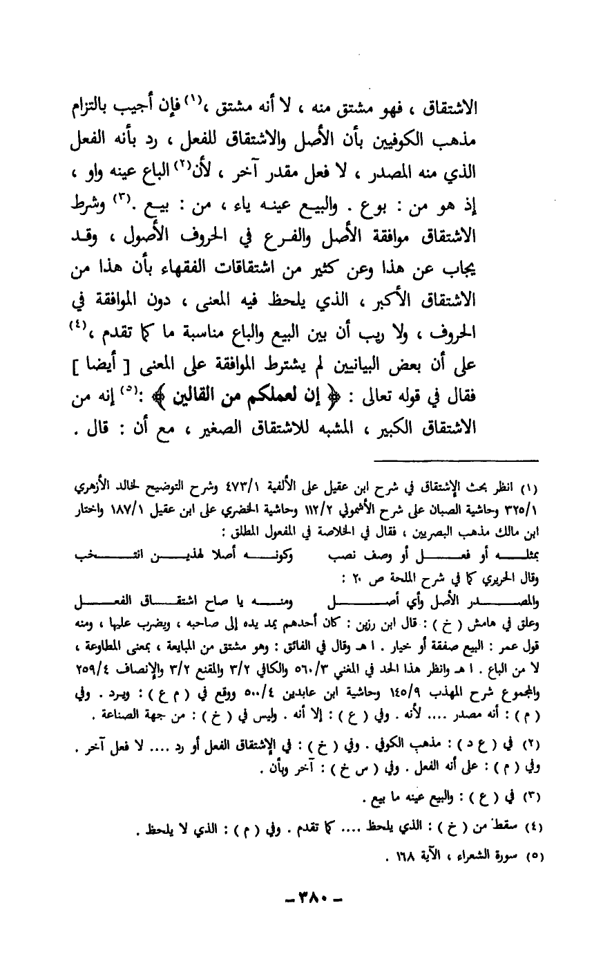 الاشتقاق، فهو مشتق منه، لا أنه مشتق، فإن أجيب بالتزام مذهب الكوفيين بأن الأصل والاشتقاق للفعل رد بأنه الفعل الذي منه المصدر، لا فعل مقدر آخر، لأن الباع عينه واو، إذ هو من: بوع. والبيع عينه ياء، من: بيع. وشرط الاشتقاق موافقة الأصل والفرع في الحروف الأصول، وقد يجاب عن هذا وعن كثير من اشتقاقات الفقهاء بأن هذا من الاشتقاق الأكبر، الذي يلحظ فيه المعنى، دون الموافقة في الحروف، ولا ريب أن بين البيع والباع مناسبة ما كما تقدم، على أن بعض البيانيين لم يشترط الموافقة على المعنى [أيضا] فقال في قَوْله تَعَالَى: {إِنِّي لِعَمَلِكُمْ مِنَ الْقَالِينَ} [الشعراء: 168] : إنه من الاشتقاق الكبير، المشبه للاشتقاق الصغير، مع أن قال