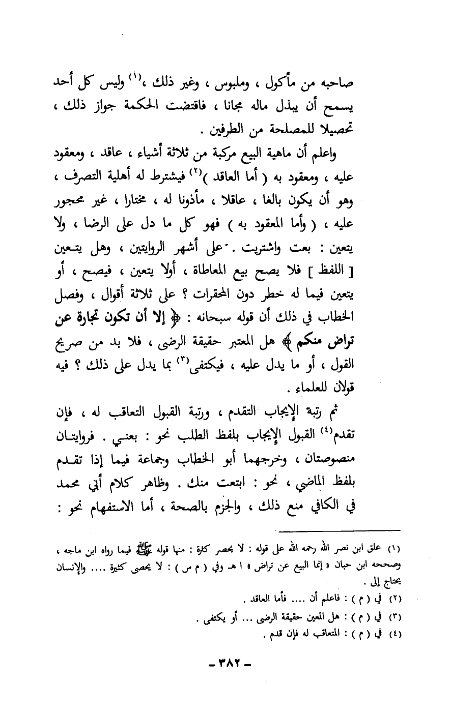 واعلم أن ماهية البيع مركبة من ثلاثة أشياء، عاقد، ومعقود عليه، ومعقود به (أما العاقد) فيشترط له أهلية التصرف، وهو أن يكون بالغا، عاقلا، مأذونا له، مختارا، غير محجور عليه، (وأما المعقود به) فهو كل ما دل على الرضا، ولا يتعين: بعت واشتريت. على أشهر الروايتين، وهل يتعين [اللفظ] فلا يصح بيع المعاطاة، أو لا يتعين، فيصح، أو يتعين فيما له خطر دون المحقرات؟ على ثلاثة أقوال، وفصل الخطاب في ذلك أن قوله سبحانه: {إِلَّا أَنْ تَكُونَ تِجَارَةً عَنْ تَرَاضٍ مِنْكُمْ} [النساء: 29] ، هل المعتبر حقيقة الرضى، فلا بد من صريح القول، أو ما يدل عليه، فيكتفى بما يدل على ذلك؟ فيه قولان للعلماء.