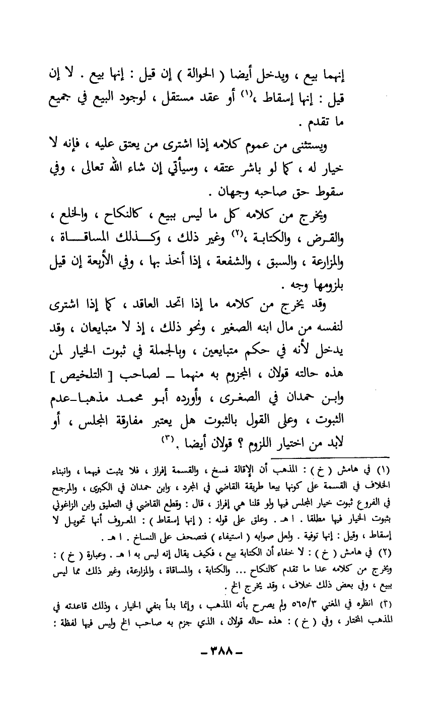 إنهما بيع، ويدخل أيضا (الحوالة) إن قيل: إنها بيع. لا إن قيل: إنها إسقاط، أو عقد مستقل، لوجود البيع في جميع ما تقدم. ويستثنى من عموم كلامه إذا اشترى من يعتق عليه، فإنه لا خيار له، كما لو باشر عتقه، وسيأتي إن شاء الله تعالى، وفي سقوط حق صاحبه وجهان. ويخرج من كلامه كل ما ليس ببيع، كالنكاح، والخلع، والقرض والكتابة، وغير ذلك، وكذلك المساقاة، والمزارعة، والسبق، والشفعة، إذا أخذ بها، وفي الأربعة إن قيل بلزومها وجه. وقد يخرج من كلامه ما إذا اتحد العاقد، كما إذا اشترى لنفسه من مال ابنه الصغير، ونحو ذلك، إذ لا متبايعان، وقد يدخل لأنه في حكم متبايعين، وبالجملة في ثبوت الخيار لمن هذه حالته قولان، المجزوم به منهما - لصاحب [التلخيص] وابن حمدان في الصغرى، وأورده أبو محمد مذهبا - عدم الثبوت، وعلى القول بالثبوت هل يعتبر مفارقة المجلس، أو لا بد من اختيار اللزوم؟ قولان أيضا.