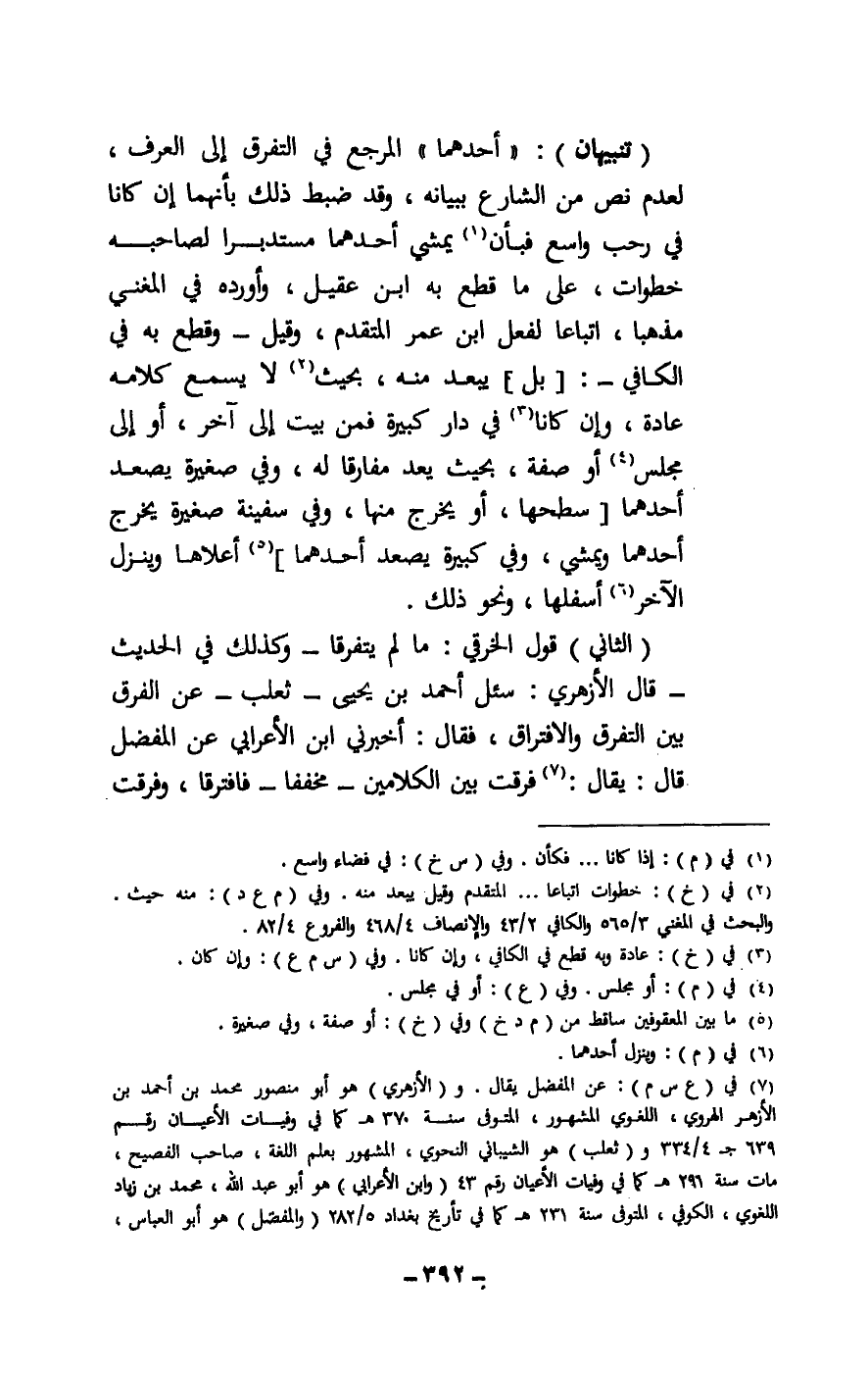 (تنبيهان) : «أحدهما» المرجع في التفرق إلى العرف لعدم نص من الشارع ببيانه، وقد ضبط ذلك بأنهما إن كانا في رحب واسع فبأن يمشي أحدهما مستدبرا لصاحبه خطوات، على ما قطع به ابن عقيل، وأورده في المغني مذهبا، اتباعا لفعل ابن عمر المتقدم، وقيل - وقطع به في الكافي -: [بل] يبعد منه، بحيث لا يسمع كلامه عادة، وإن كانا في دار كبيرة فمن بيت إلى آخر، أو إلى مجلس أو صفة، بحيث يعد مفارقا له، وفي صغيرة يصعد أحدهما سطحها، أو يخرج منها، وفي سفينة صغيرة يخرج أحدهما ويمشي، وفي كبيرة يصعد أحدهما أعلاها وينزل الآخر أسفلها، ونحو ذلك.