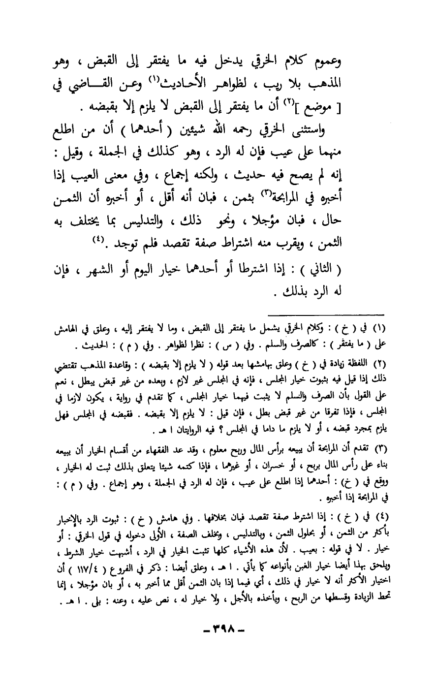 واستثنى الخرقي - رَحِمَهُ اللَّهُ - شيئين (أحدهما) أن من اطلع منهما على عيب فإن له الرد، وهو كذلك في الجملة، وقيل: إنه لم يصح فيه حديث، ولكنه إجماع، وفي معنى العيب إذا أخبره في المرابحة بثمن، فبان أنه أقل، أو أخبره أن الثمن حال، فبان مؤجلا، ونحو ذلك، والتدليس بما يختلف به الثمن، ويقرب منه اشتراط صفة تقصد فلم توجد.