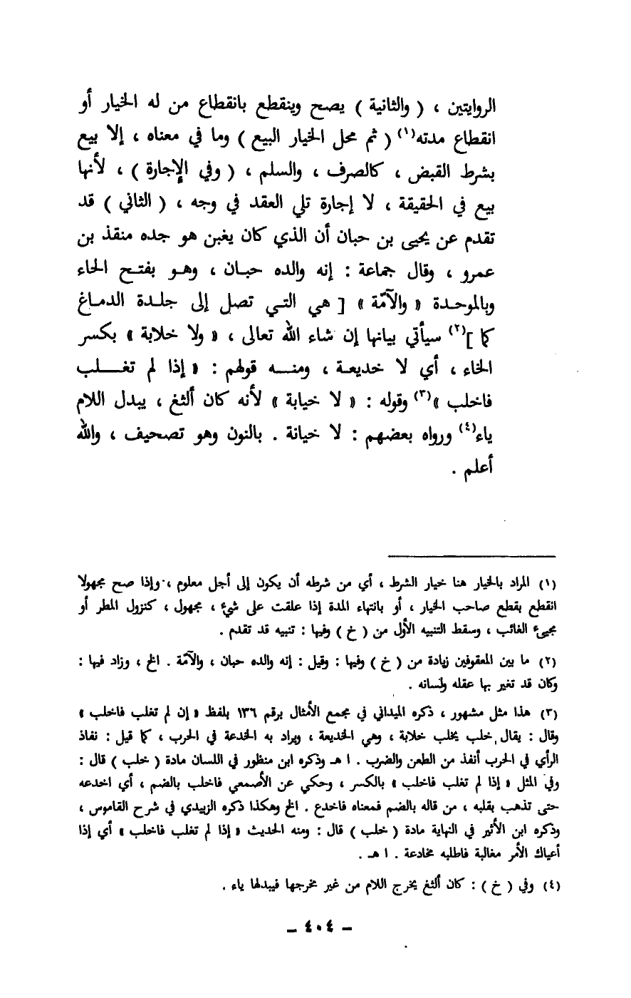 الروايتين، (والثانية) يصح وينقطع بانقطاع من له الخيار أو انقطاع مدته (ثم محل الخيار البيع) وما في معناه، إلا بيع بشرط القبض، كالصرف، والسلم، (وفي الإجارة) ، لأنها بيع في الحقيقة، لا إجارة تلي العقد في وجه، (الثاني) قد تقدم عن يحيى بن حبان أن الذي كان يغبن هو جده منقذ بن عمرو، وقال جماعة: إنه والده حبان، وهو بفتح الحاء وبالموحدة «والآمة» [هي التي تصل إلى جلدة الدماغ كما] سيأتي بيانها إن شاء الله تعالى، ولا خلابة بكسر الخاء، أي لا خديعة، ومنه قولهم: «إذا لم تغلب فاخلب» وقوله: لا خيابة لأنه كان ألثغ، يبدل اللام ياء ورواه بعضهم: لا خيانة. بالنون وهو تصحيف، والله أعلم.