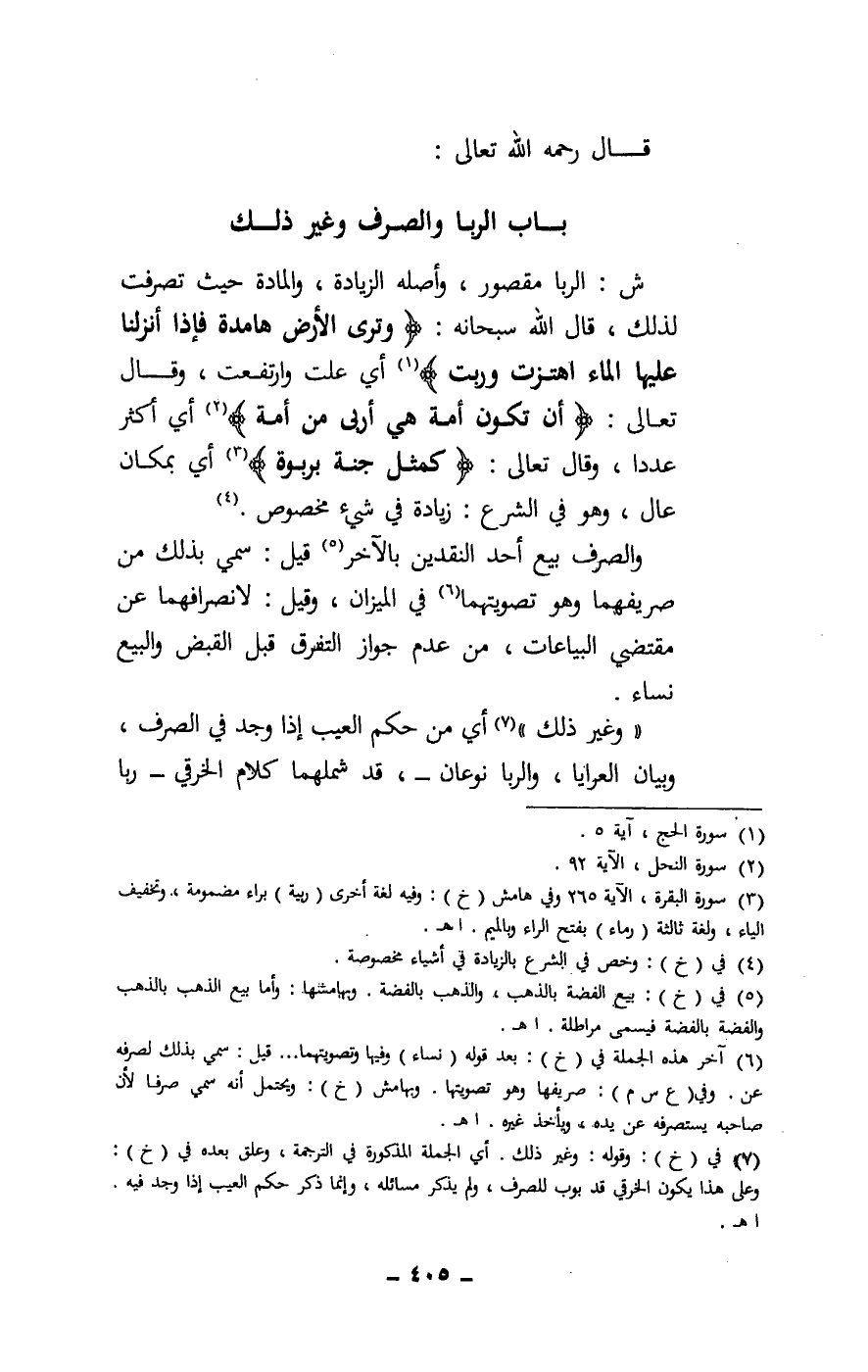 ش: الربا مقصور، وأصله الزيادة، والمادة حيث تصرفت لذلك، قال الله سبحانه: {وَتَرَى الْأَرْضَ هَامِدَةً فَإِذَا أَنْزَلْنَا عَلَيْهَا الْمَاءَ اهْتَزَّتْ وَرَبَتْ} [الحج: 5] أي علت وارتفعت، وقال تعالى: {أَنْ تَكُونَ أُمَّةٌ هِيَ أَرْبَى مِنْ أُمَّةٍ} [النحل: 92] أي أكثر عددا، وقال تعالى: {كَمَثَلِ جَنَّةٍ بِرَبْوَةٍ} [البقرة: 265] أي بمكان عال، وهو في الشرع: زيادة في شيء مخصوص.