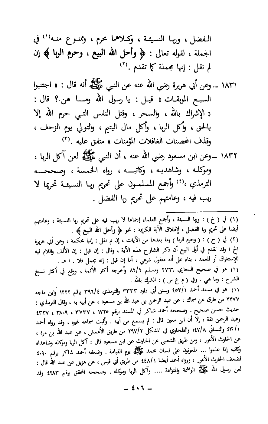 1832 - وعن ابن مسعود - رَضِيَ اللَّهُ عَنْهُ -، أن النبي - صَلَّى اللَّهُ عَلَيْهِ وَسَلَّمَ - «لعن آكل الربا، وموكله، وشاهديه، وكاتبه» ، رواه الخمسة، وصححه الترمذي، وأجمع المسلمون على تحريم ربا النسيئة تحريما لا ريب فيه، وعامتهم على تحريم ربا الفضل.