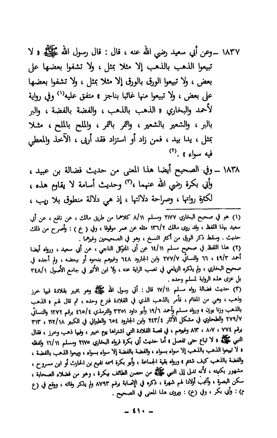 1837 - وعن أبي سعيد - رَضِيَ اللَّهُ عَنْهُ -، قال: قال رسول الله - صَلَّى اللَّهُ عَلَيْهِ وَسَلَّمَ - «لا تبيعوا الذهب بالذهب إلا مثلا بمثل، ولا تشفوا بعضها على بعض، ولا تبيعوا الورق بالورق إلا مثلا بمثل، ولا تشفوا بعضها على بعض، ولا تبيعوا منها غائبا بناجز» متفق عليه وفي رواية لأحمد والبخاري «الذهب بالذهب، والفضة بالفضة، والبر بالبر، والشعير بالشعير، والتمر بالتمر، والملح بالملح، مثلا بمثل، يدا بيد، فمن زاد أو استزاد فقد أربى، الآخذ والمعطي فيه سواء» .