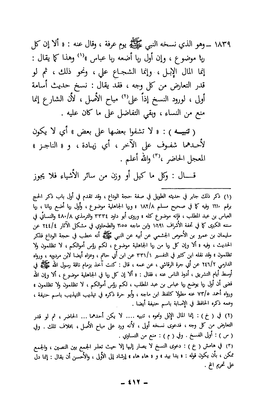 1839 - وهو الذي نسخه النبي - صَلَّى اللَّهُ عَلَيْهِ وَسَلَّمَ - يوم عرفة، وقال عنه: «ألا إن كل ربا موضوع، وإن أول ربا أضعه ربا عباس» وهذا كما يقال: إنما المال الإبل، وإنما الشجاع علي، ونحو ذلك، ثم لو قدر التعارض من كل وجه، فقد يقال: نسخ حديث أسامة أولى، لورود النسخ إذا على مباح الأصل، لأن الشارع إنما منع من النساء، وبقي التفاضل على ما كان عليه.