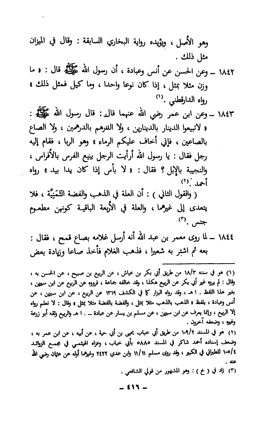 1844 - لما روى معمر بن عبد الله أنه أرسل غلامه بصاع قمح، فقال: بعه ثم اشتر به شعيرا، فذهب الغلام فأخذ صاعا زيادة بعض
