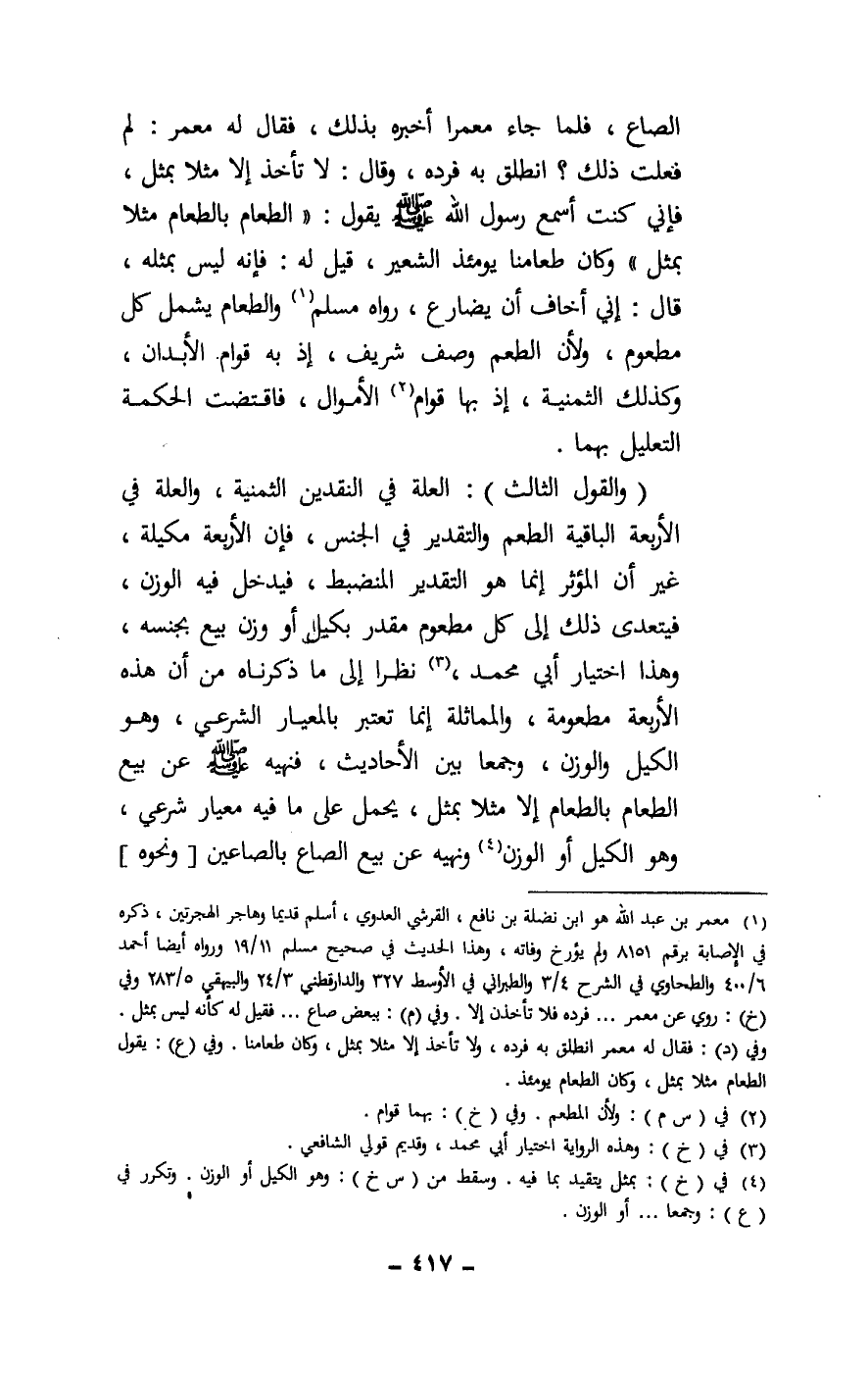 الصاع، فلما جاء معمرا أخبره بذلك، فقال له معمر: لم فعلت ذلك؟ انطلق به فرده، وقال: لا تأخذ إلا مثلا بمثل، فإني كنت أسمع رسول الله - صَلَّى اللَّهُ عَلَيْهِ وَسَلَّمَ - يقول: «الطعام بالطعام مثلا بمثل» وكان طعامنا يومئذ الشعير، قيل له: فإنه ليس بمثله، قال: إني أخاف أن يضارع، رواه مسلم والطعام يشمل كل مطعوم، ولأن الطعم وصف شريف، إذ به قوام الأبدان، وكذلك الثمنية، إذ بها قوام الأموال، فاقتضت الحكمة التعليل بهما.