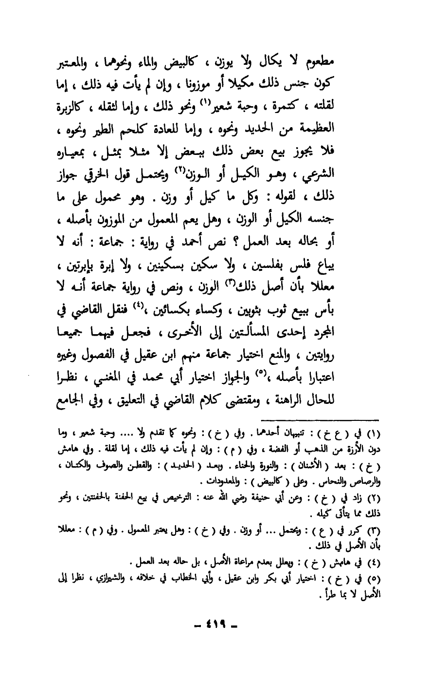 مطعوم لا يكال ولا يوزن، كالبيض والماء ونحوهما، والمعتبر كون جنس ذلك مكيلا أو موزونا، وإن لم يأت فيه ذلك، إما لقلته، كتمرة، وحبة شعير ونحو ذلك، وإما لثقله، كالزبرة العظيمة من الحديد ونحوه، وإما للعادة كلحم الطير ونحوه، فلا يجوز بيع بعض ذلك ببعض إلا مثلا بمثل، بمعياره الشرعي، وهو الكيل أو الوزن ويحتمل قول الخرقي جواز ذلك، لقوله: وكل ما كيل أو وزن. وهو محمول على ما جنسه الكيل أو الوزن، وهل يعم المعمول من الموزون بأصله، أو بحاله بعد العمل؟ نص أحمد في رواية: جماعة: أنه لا يباع فلس بفلسين، ولا سكين بسكينين، ولا إبرة بإبرتين، معللا بأن أصل ذلك الوزن، ونص في رواية جماعة أنه لا بأس ببيع ثوب بثوبين، وكساء بكسائين، فنقل القاضي في المجرد إحدى المسألتين إلى الأخرى، فجعل فيهما جميعا روايتين، والمنع اختيار جماعة منهم ابن عقيل في الفصول وغيره اعتبارا بأصله، والجواز اختيار أبي محمد في المغني، نظرا للحال الراهنة، ومقتضى كلام القاضي في التعليق، وفي الجامع