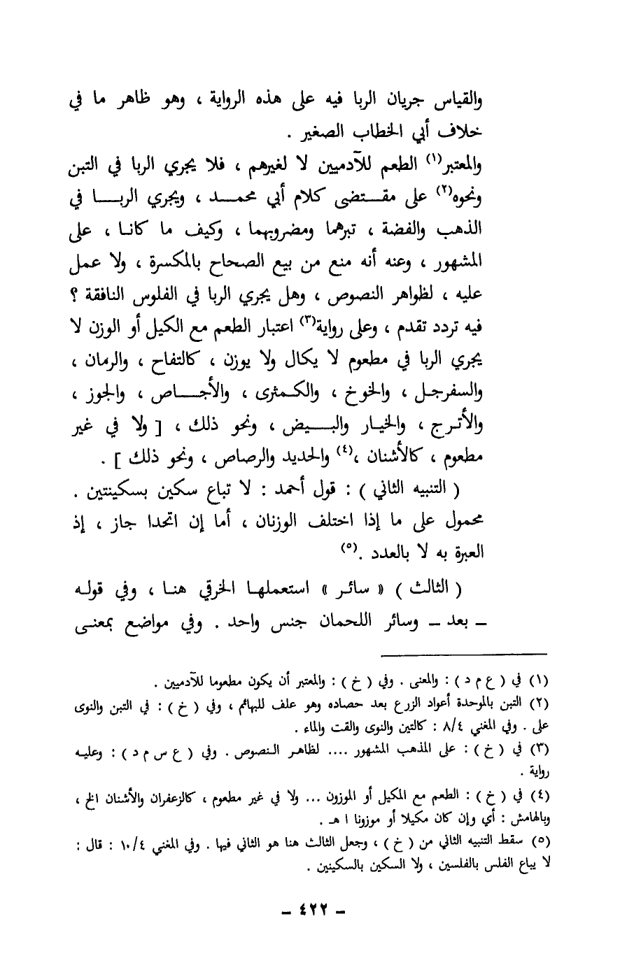 والمعتبر الطعم للآدميين لا لغيرهم، فلا يجري الربا في التبن ونحوه على مقتضى كلام أبي محمد، ويجري الربا في الذهب والفضة، تبرهما ومضروبهما، وكيف ما كانا، على المشهور، وعنه أنه منع من بيع الصحاح بالمكسرة، ولا عمل عليه، لظواهر النصوص، وهل يجري الربا في الفلوس النافقة؟ فيه تردد تقدم، وعلى رواية اعتبار الطعم مع الكيل أو الوزن لا يجري الربا في مطعوم لا يكال ولا يوزن، كالتفاح، والرمان، والسفرجل، والخوخ، والكمثرى، والأجاص، والجوز، والأترج، والخيار والبيض، ونحو ذلك، [ولا في غير مطعوم، كالأشنان، والحديد والرصاص، ونحو ذلك] .