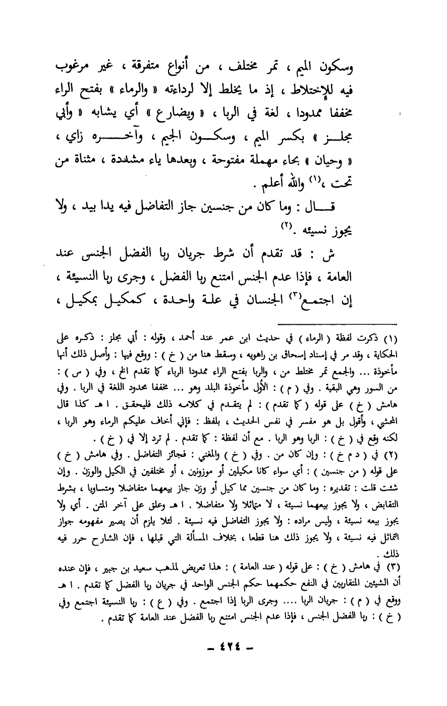 ش: قد تقدم أن شرط جريان ربا الفضل الجنس عند العامة، فإذا عدم الجنس امتنع ربا الفضل، وجرى ربا النسيئة، إن اجتمع الجنسان في علة واحدة، كمكيل بمكيل،