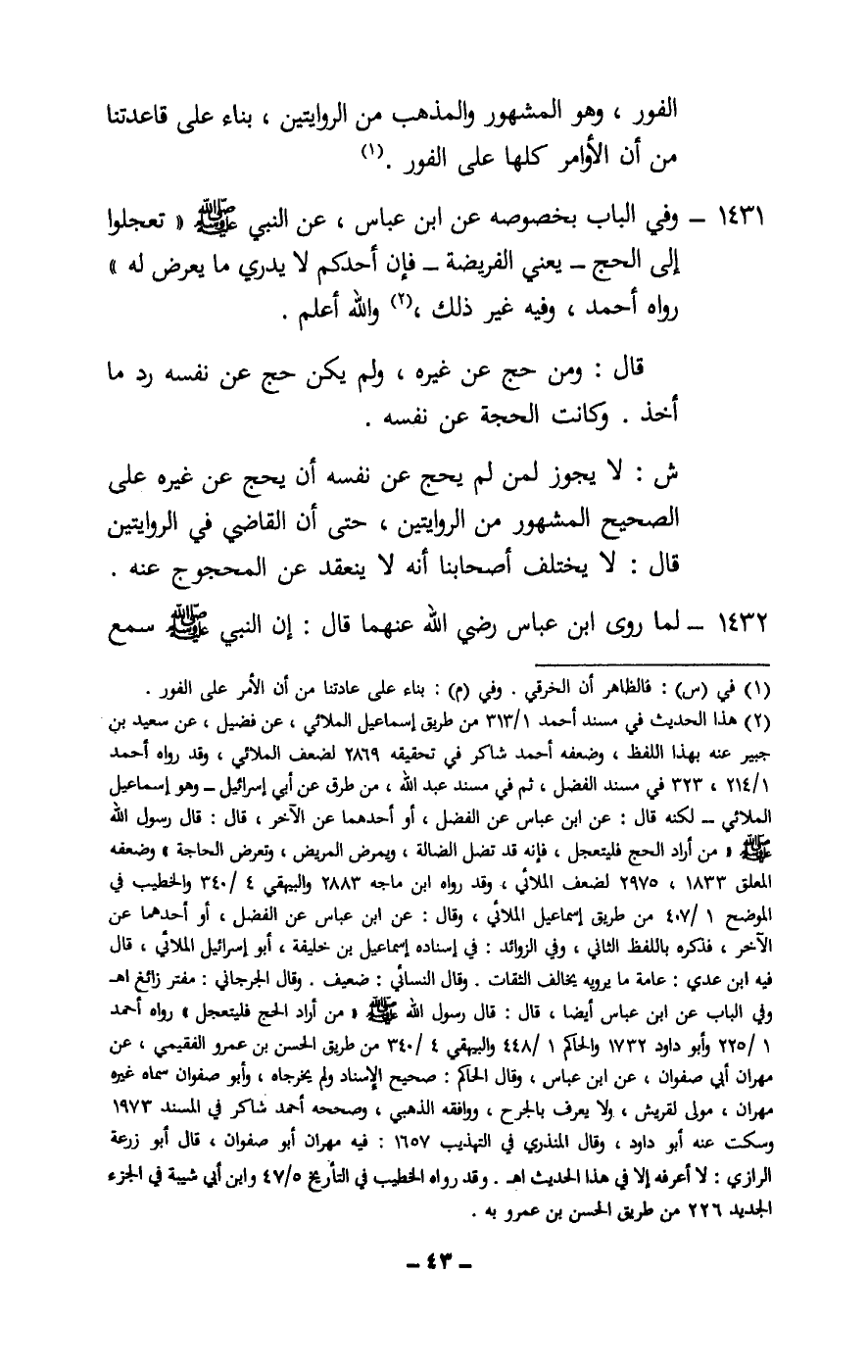 1431 - وفي الباب بخصوصه عن ابن عباس، عن النبي - صَلَّى اللَّهُ عَلَيْهِ وَسَلَّمَ - «تعجلوا إلى الحج - يعني الفريضة - فإن أحدكم لا يدري ما يعرض له» رواه أحمد، وفيه غير ذلك، والله أعلم.