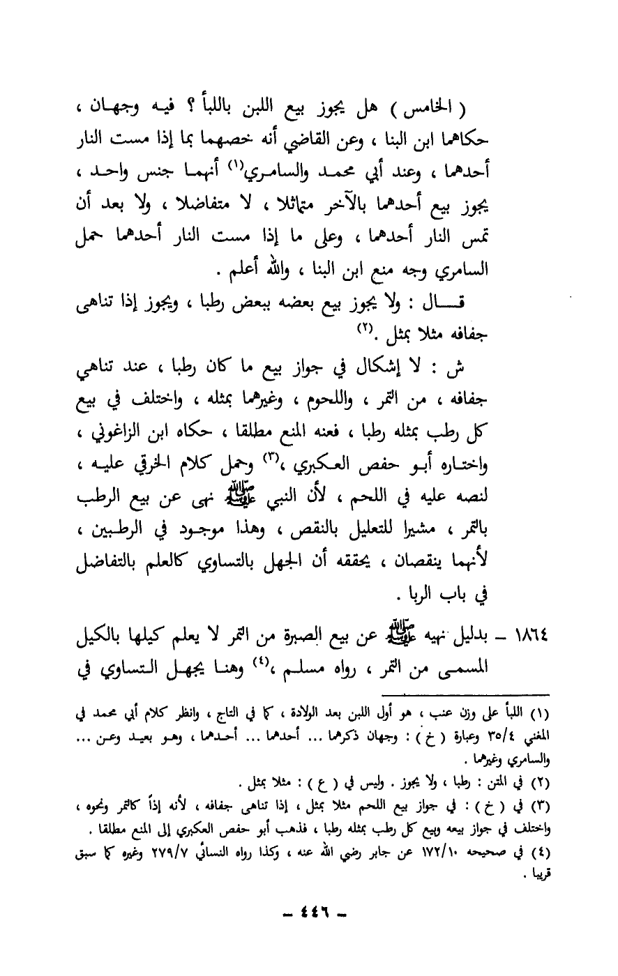 ش: لا إشكال في جواز بيع ما كان رطبا، عند تناهي جفافه، من التمر، واللحوم، وغيرهما بمثله، واختلف في بيع كل رطب بمثله رطبا، فعنه المنع مطلقا، حكاه ابن الزاغوني، واختاره أبو حفص العكبري، وحمل كلام الخرقي عليه، لنصه عليه في اللحم، لأن النبي - صَلَّى اللَّهُ عَلَيْهِ وَسَلَّمَ - نهى عن بيع الرطب بالتمر، مشيرا للتعليل بالنقص، وهذا موجود في الرطبين، لأنهما ينقصان، يحققه أن الجهل بالتساوي كالعلم بالتفاضل في باب الربا.
