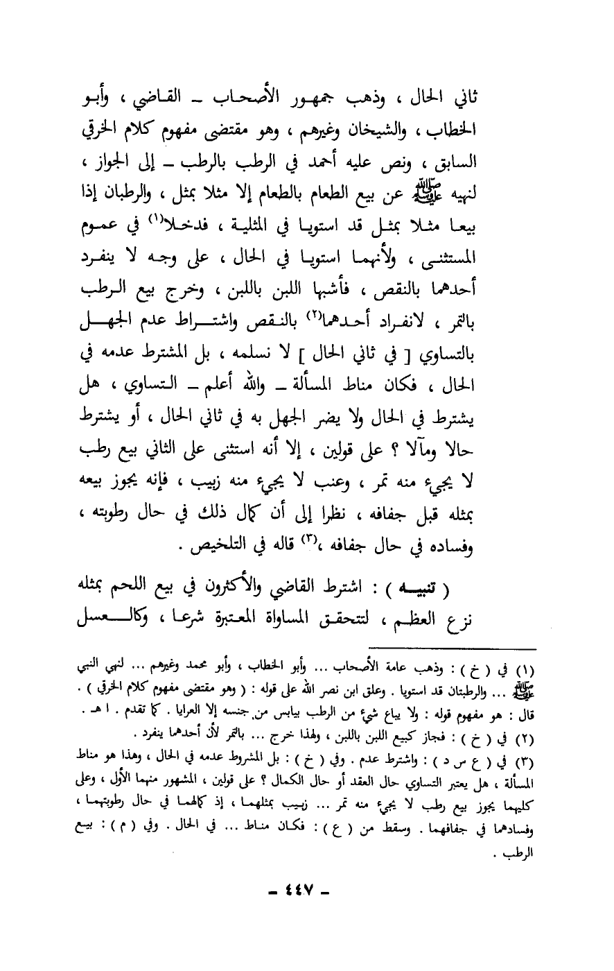 ثاني الحال، وذهب جمهور الأصحاب - القاضي، وأبو الخطاب، والشيخان وغيرهم، وهو مقتضى مفهوم كلام الخرقي السابق، ونص عليه أحمد في الرطب بالرطب - إلى الجواز، لنهيه - صَلَّى اللَّهُ عَلَيْهِ وَسَلَّمَ - عن بيع الطعام بالطعام إلا مثلا بمثل، والرطبان إذا بيعا مثلا بمثل قد استويا في المثلية، فدخلا في عموم المستثنى، ولأنهما استويا في الحال، على وجه لا ينفرد أحدهما بالنقص، فأشبها اللبن باللبن، وخرج بيع الرطب بالتمر، لانفراد أحدهما بالنقص واشتراط عدم الجهل بالتساوي [في ثاني الحال] لا نسلمه، بل المشترط عدمه في الحال، فكان مناط المسألة - والله أعلم - التساوي، هل يشترط في الحال ولا يضر الجهل به في ثاني الحال، أو يشترط حالا ومآلا؟ على قولين، إلا أنه استثنى على الثاني بيع رطب لا يجيء منه تمر، وعنب لا يجيء منه زبيب، فإنه يجوز بيعه بمثله قبل جفافه، نظرا إلى أن كمال ذلك في حال رطوبته، وفساده في حال جفافه، قاله في التلخيص.