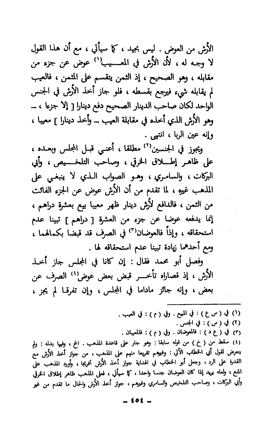 الأرش من العوض. ليس بجيد، كما سيأتي، مع أن هذا القول لا وجه له، لأن الأرش في المعيب عوض عن جزء من مقابله، وهو الصحيح، إذ الثمن يتقسم على المثمن، فالعيب لم يقابله شيء فيرجع بقسطه، فلو جاز أخذ الأرش في الجنس الواحد لكان صاحب الدينار الصحيح دفع دينارا [إلا جزءا - وهو الأرش الذي أخذه في مقابلة العيب - وأخذ دينارا] معيبا، وإنه عين الربا، انتهى.