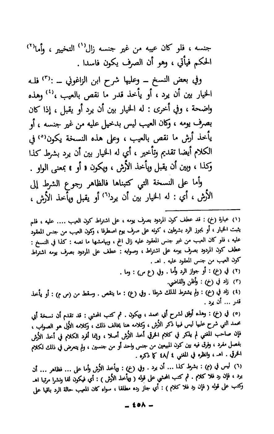وفي بعض النسخ - وعليها شرح ابن الزاغوني -: فله الخيار بين أن يرد، أو يأخذ قدر ما نقص بالعيب، وهذه واضحة، وفي أخرى: له الخيار بين أن يرد أو يقبل، إذا كان بصرف يومه، وكان العيب ليس بدخيل عليه من غير جنسه، أو يأخذ أرش ما نقص بالعيب، وعلى هذه النسخة يكون في الكلام أيضا تقديم وتأخير، أي له الخيار بين أن يرد بشرط كذا وكذا، وبين أن يقبل ويأخذ الأرش، ويكون «أو» بمعنى الواو.