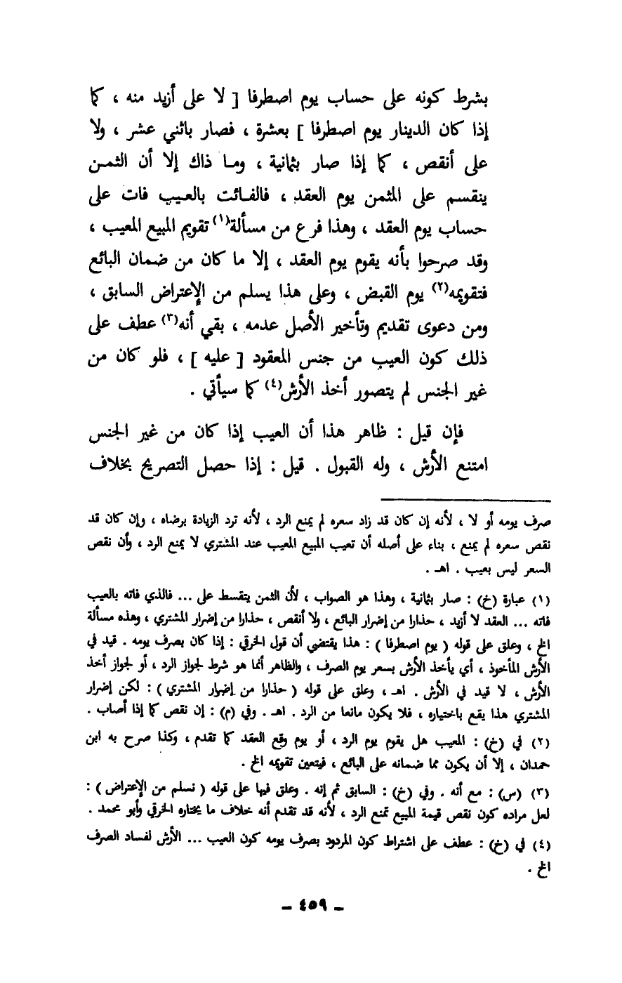بشرط كونه على حساب يوم اصطرفا [لا على أزيد منه، كما إذا كان الدينار يوم اصطرفا] بعشرة، فصار باثني عشر، ولا على أنقص، كما إذا صار بثمانية، وما ذاك إلا أن الثمن ينقسم على المثمن يوم العقد، فالفائت بالعيب فات على حساب يوم العقد، وهذا فرع من مسألة تقويم المبيع المعيب، وقد صرحوا بأنه يقوم يوم العقد، إلا ما كان من ضمان البائع فتقويمه يوم القبض، وعلى هذا يسلم من الاعتراض السابق، ومن دعوى تقديم وتأخير الأصل عدمه، بقي أنه عطف على ذلك كون العيب من جنس المعقود [عليه] ، فلو كان من غير الجنس لم يتصور أخذ الأرض كما سيأتي.