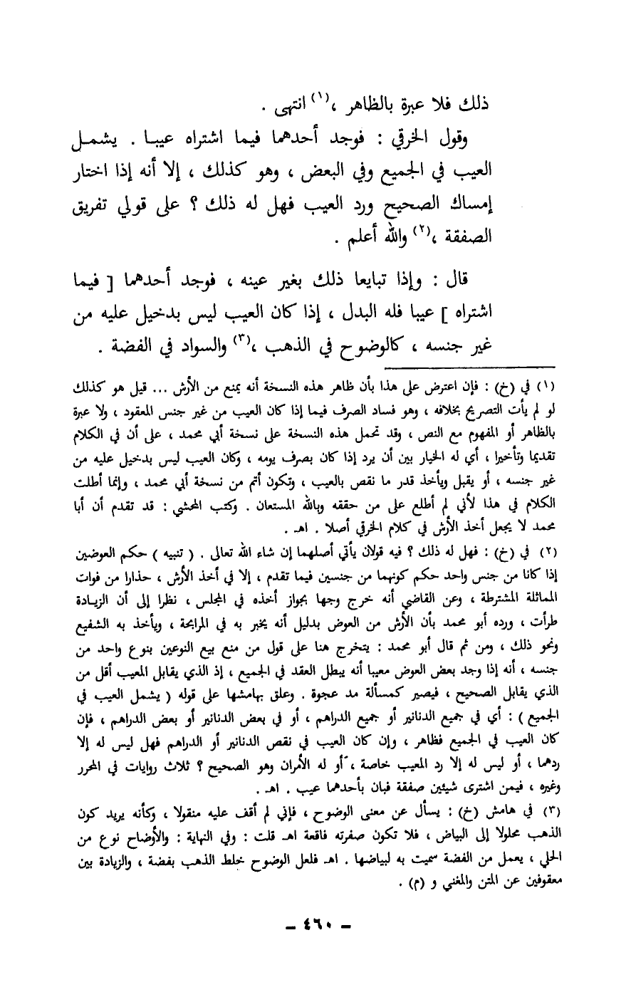 قال: وإذا تبايعا ذلك بغير عينه، فوجد أحدهما [فيما اشتراه] عيبا فله البدل، إذا كان العيب ليس بدخيل عليه من غير جنسه، كالوضوح في الذهب، والسواد في الفضة.