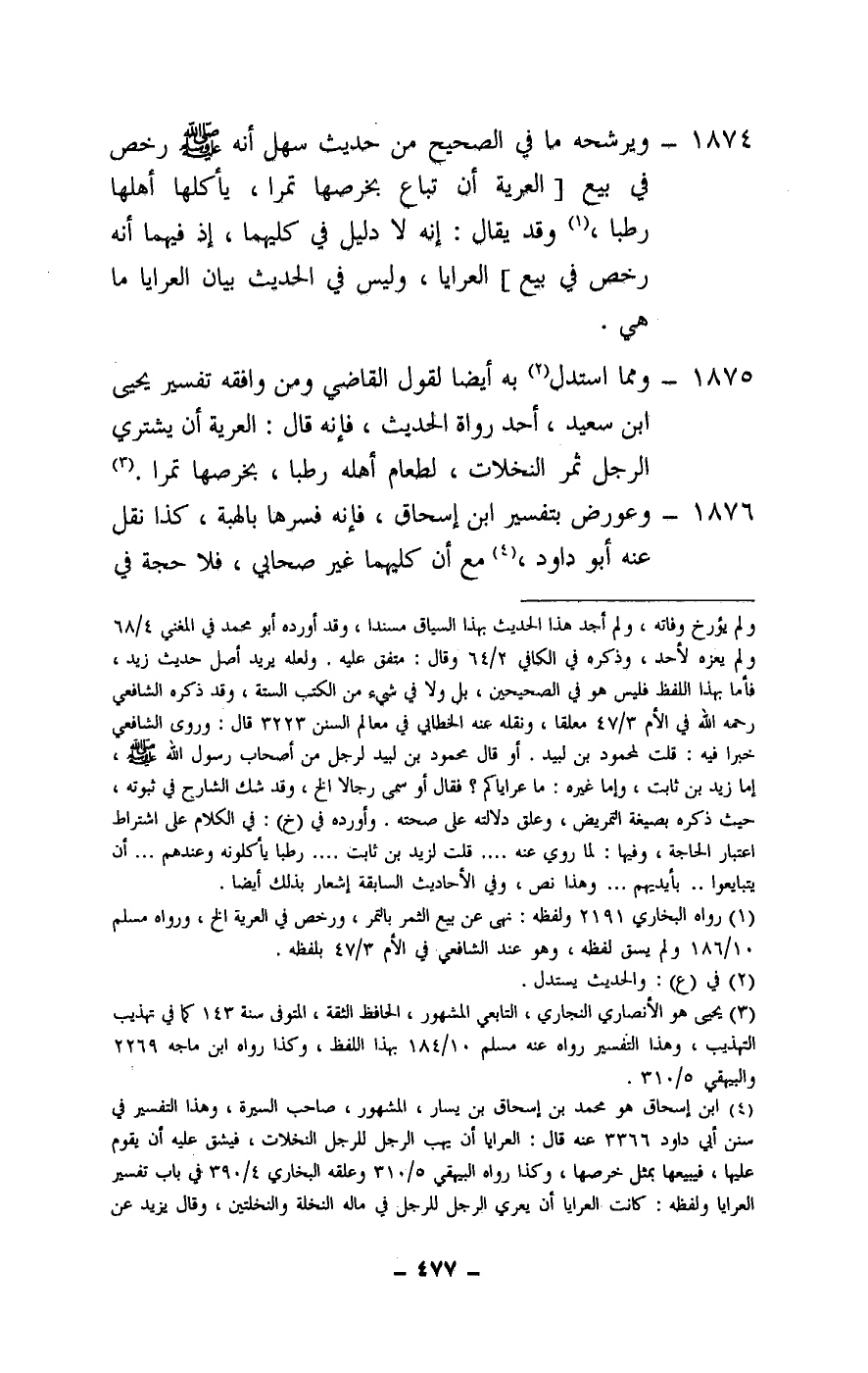 1875 - ومما استدل به أيضا لقول القاضي ومن وافقه تفسير يحيى بن سعيد، أحد رواة الحديث، فإنه قال: العرية أن يشتري الرجل ثمر النخلات، لطعام أهله رطبا، بخرصها تمرا.