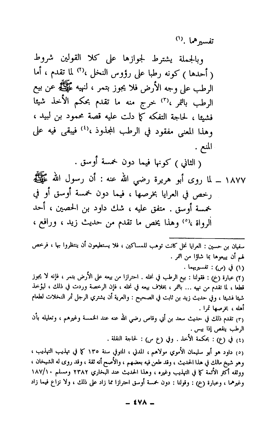 1877 - لما روى أبو هريرة - رَضِيَ اللَّهُ عَنْهُ -: «أن رسول الله - صَلَّى اللَّهُ عَلَيْهِ وَسَلَّمَ - رخص في العرايا بخرصها، فيما دون خمسة أوسق أو في خمسة أوسق» . متفق عليه، شك داود بن الحصين، أحد الرواة، وهذا يخص ما تقدم من حديث زيد، ورافع