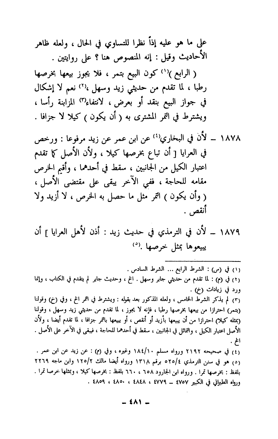 1879 - لأن في الترمذي في حديث زيد: «أذن لأهل العرايا] أن يبيعوها بمثل خرصها» .